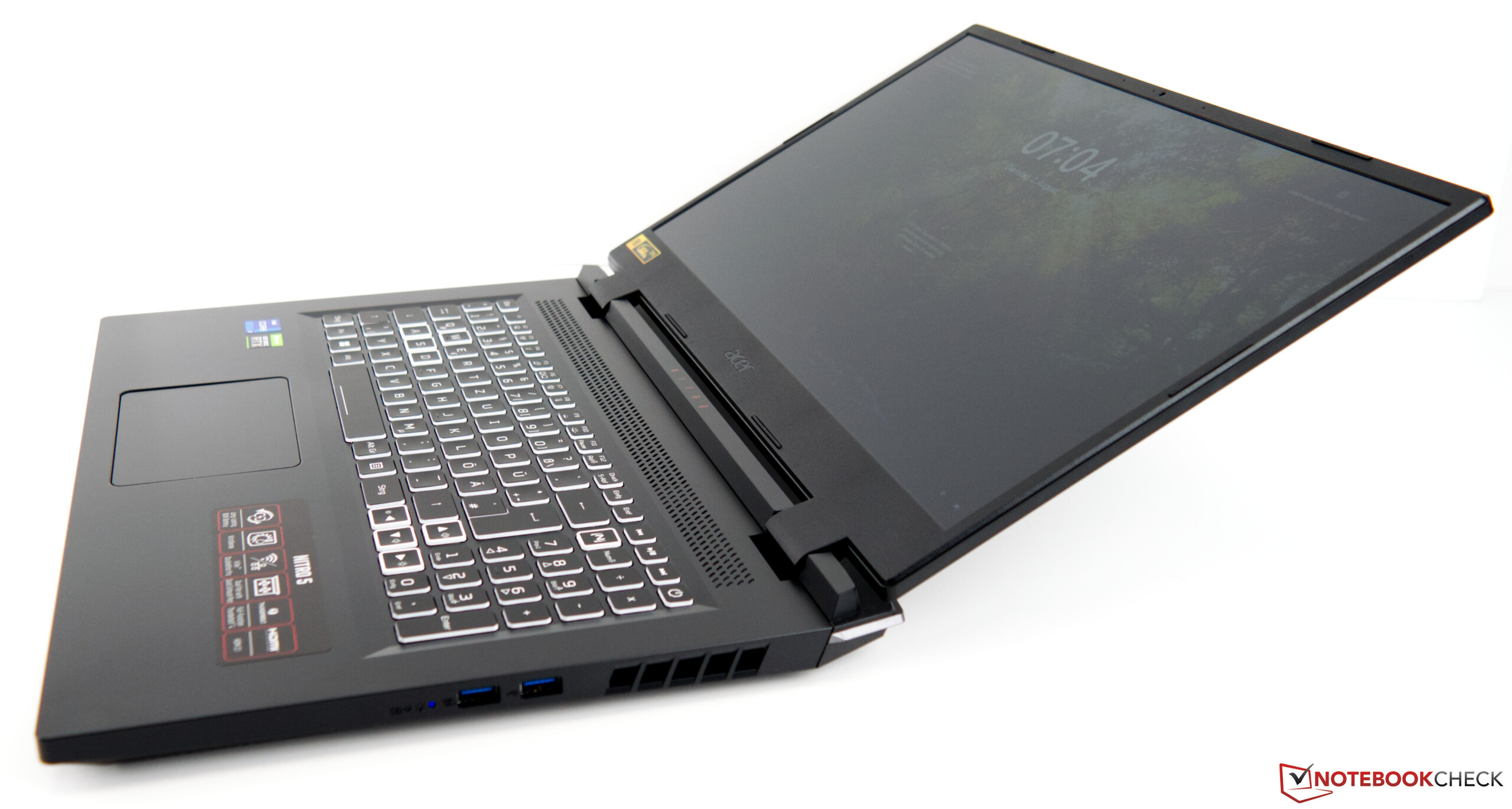 The Acer Nitro 5 AN517 is clearly recognizable as a gaming notebook, even though the manufacturer does not use RGB at all. The device only offers visual highlights on the display lid in the form of colored accents that loosen up the seriousness of the otherwise completely black case. Due to its size, the stability of the base is good, even if it yields under selective pressure. The display lid could also have done with a little more rigidity, but other 17-inch notebooks can also be easily twisted, which is due to their size. Selective impacts of force are well absorbed. The opening angle of the display doesn't quite reach 180°, but this is not cause for complaint. The two hinges are smooth-running, so one-handed opening is not an issue. However, relatively large amounts of teetering cannot be prevented.