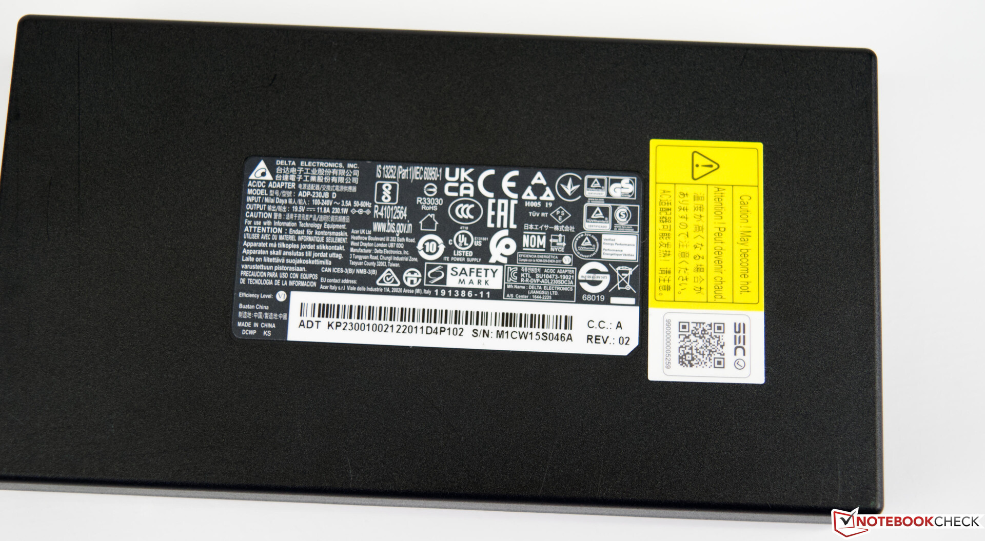 In addition to the notebook, buyers receive an almost 800 g heavy 230 watt power adapter as well as some information booklets.