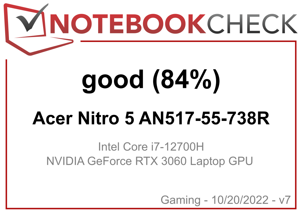| 83.9 % v7 (old) | 08 / 2022 | Acer Nitro 5 AN517-55-738R i7-12700H, GeForce RTX 3060 Laptop GPU | 3.1 kg | 28.6 mm | 17.30" | 1920x1080 | |