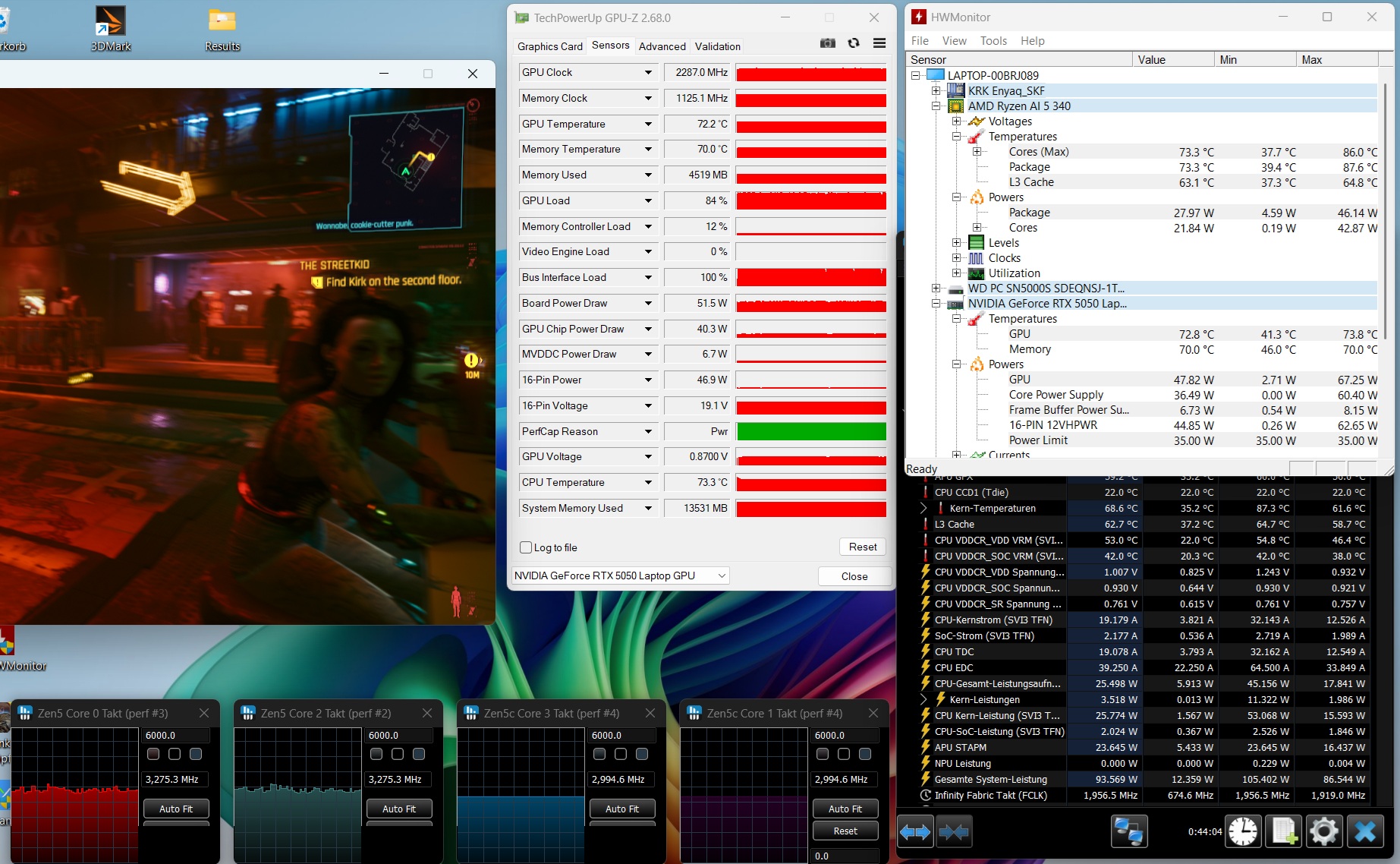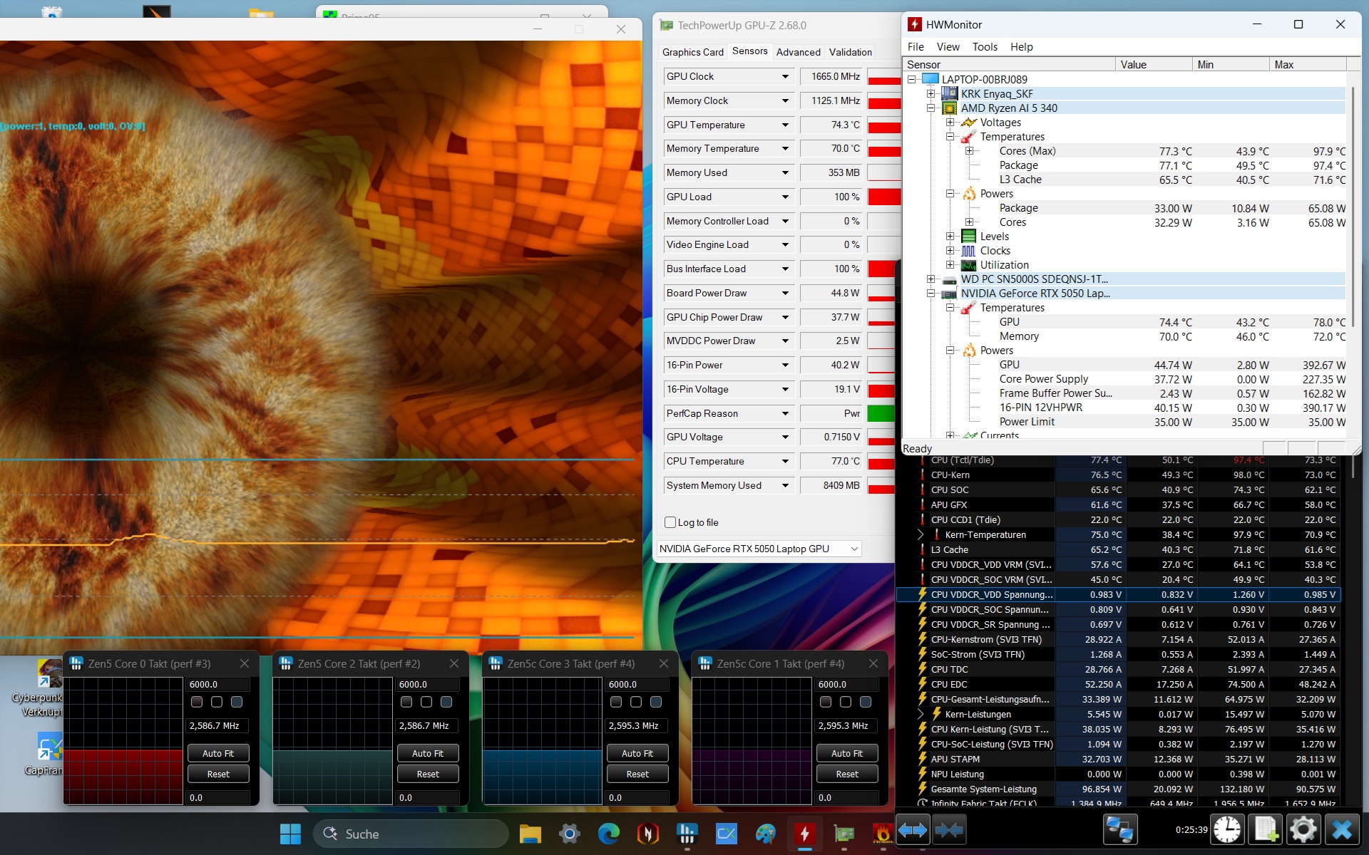 | Acer Nitro V14 AI ANV14-62-R9LT Ryzen AI 5 340, GeForce RTX 5050 Laptop | Acer Nitro V 16 AI ANV16-42-R860 R5 240, GeForce RTX 5050 Laptop | HP Victus 15-fa2160ng i5-13420H, GeForce RTX 5050 Laptop | Lenovo LOQ 15AHP10 R7 250, GeForce RTX 5060 Laptop | Lenovo Legion 5 15AHP G10 R7 260, GeForce RTX 5060 Laptop | Schenker XMG Core 15 (M25) Ryzen AI 7 350, GeForce RTX 5060 Laptop | Razer Blade 14 2025 Ryzen AI 9 365, GeForce RTX 5070 Laptop | Average of class Gaming | |