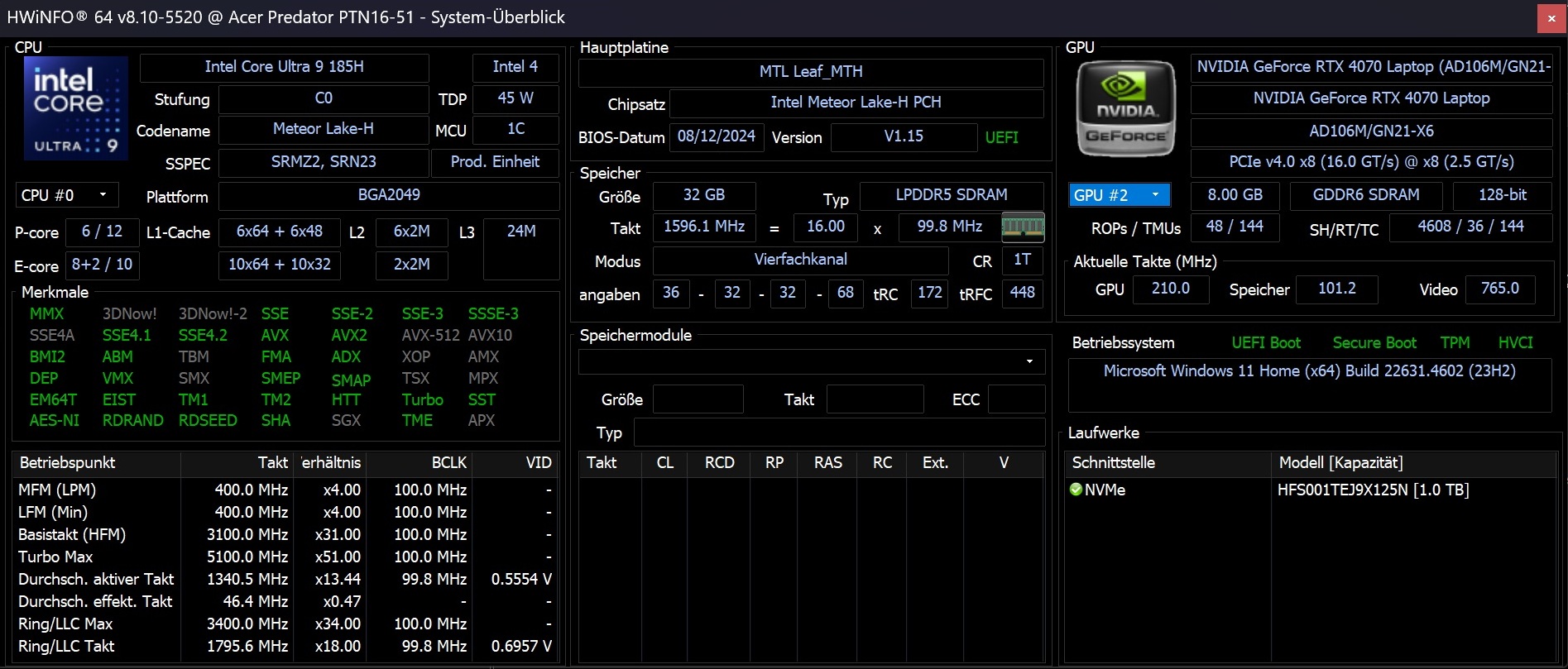 Acer has equipped our test configuration with a Core Ultra 9 185H from the Meteor Lake series and—as mentioned earlier—with a GeForce RTX 4070. It also features an impressive 32 GB of LPDDR5X RAM. The installed NVMe SSD has a capacity of 1 TB. The laptop's screen has a 16:10 aspect ratio and its operating system is Windows 11 Home. Its battery capacity of 76 Wh is neither low nor particularly generous.