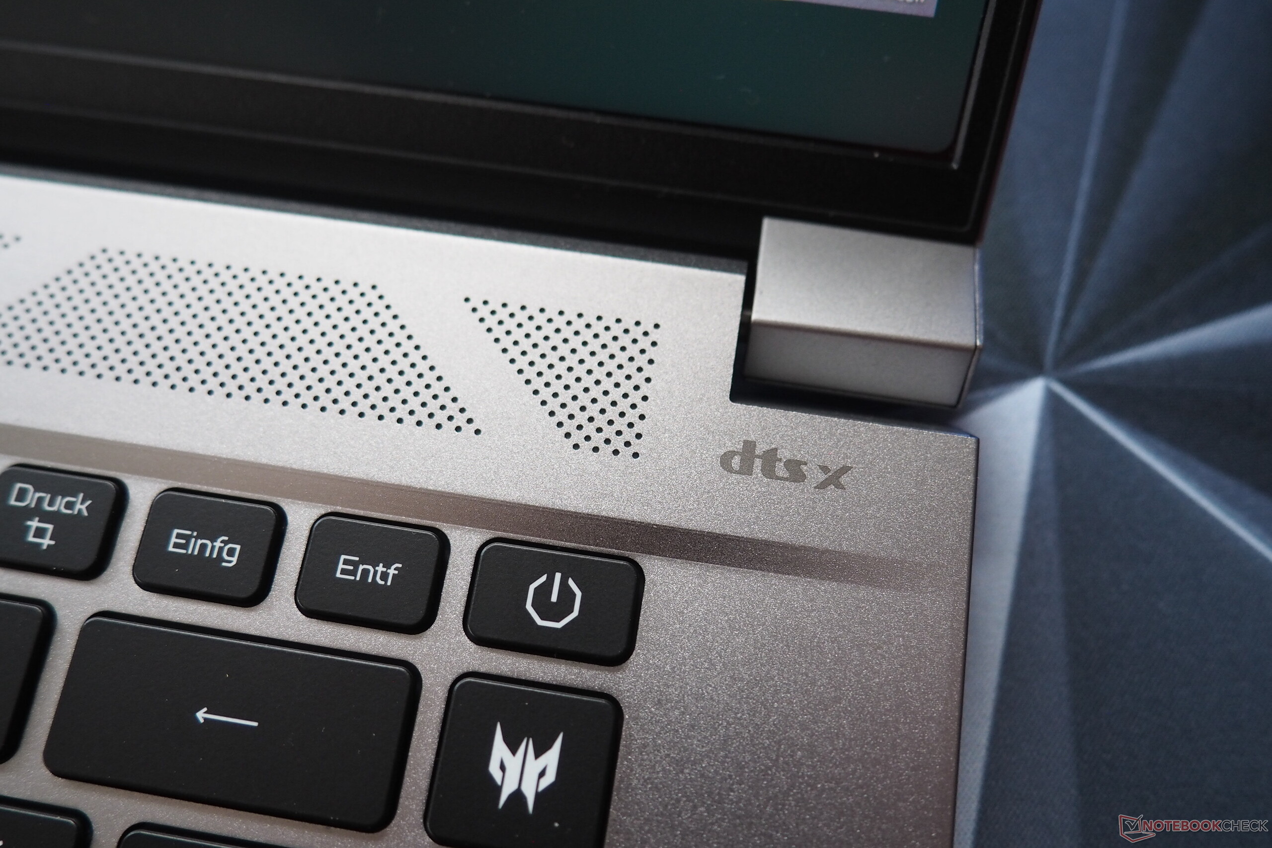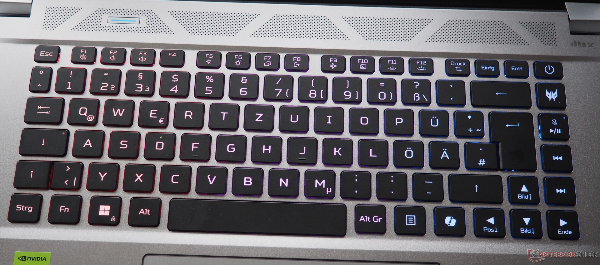 For a rubber dome model, the keyboard delivers more than decent feedback and typing feel. Acer has chosen a fairly classic layout, whereby the manufacturer has spared a number pad and limited itself to a single column to the right of the "main block", which is intended for media control and for opening the Predator Sense system software. With the exception of the function row, all keys are reasonably sized—including the directional arrows. Gamers can look forward to multi-level adjustable RGB lighting divided into three zones.