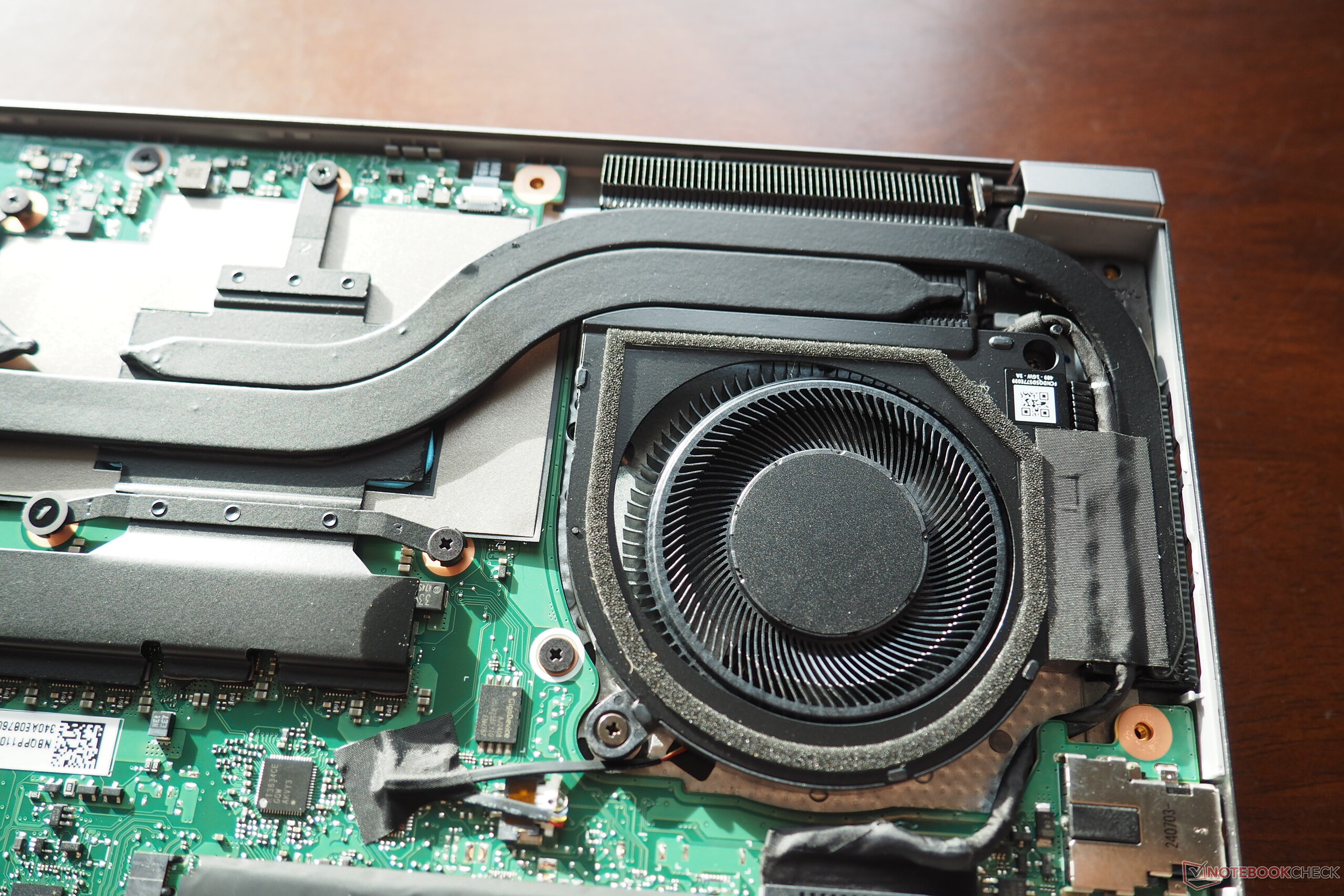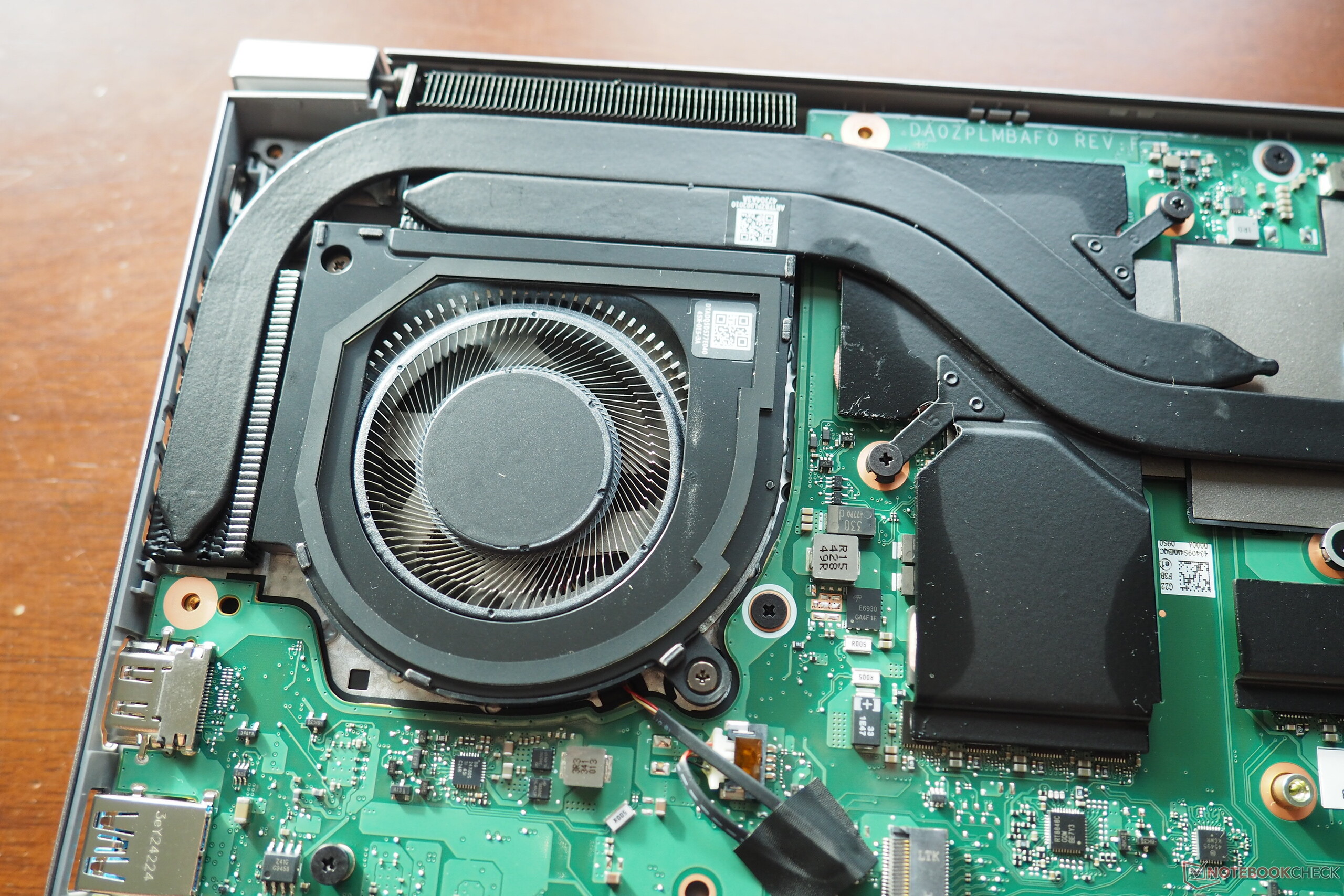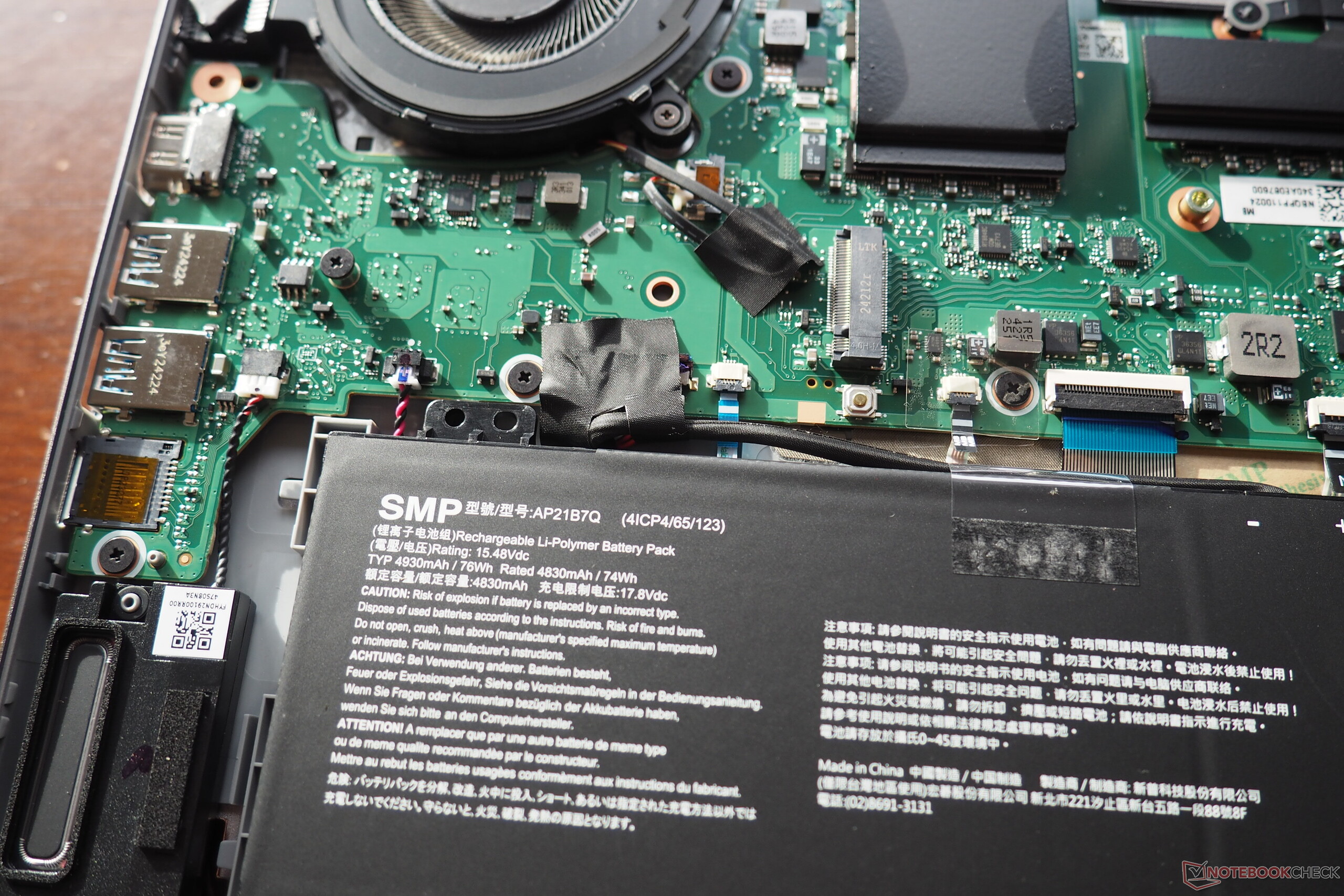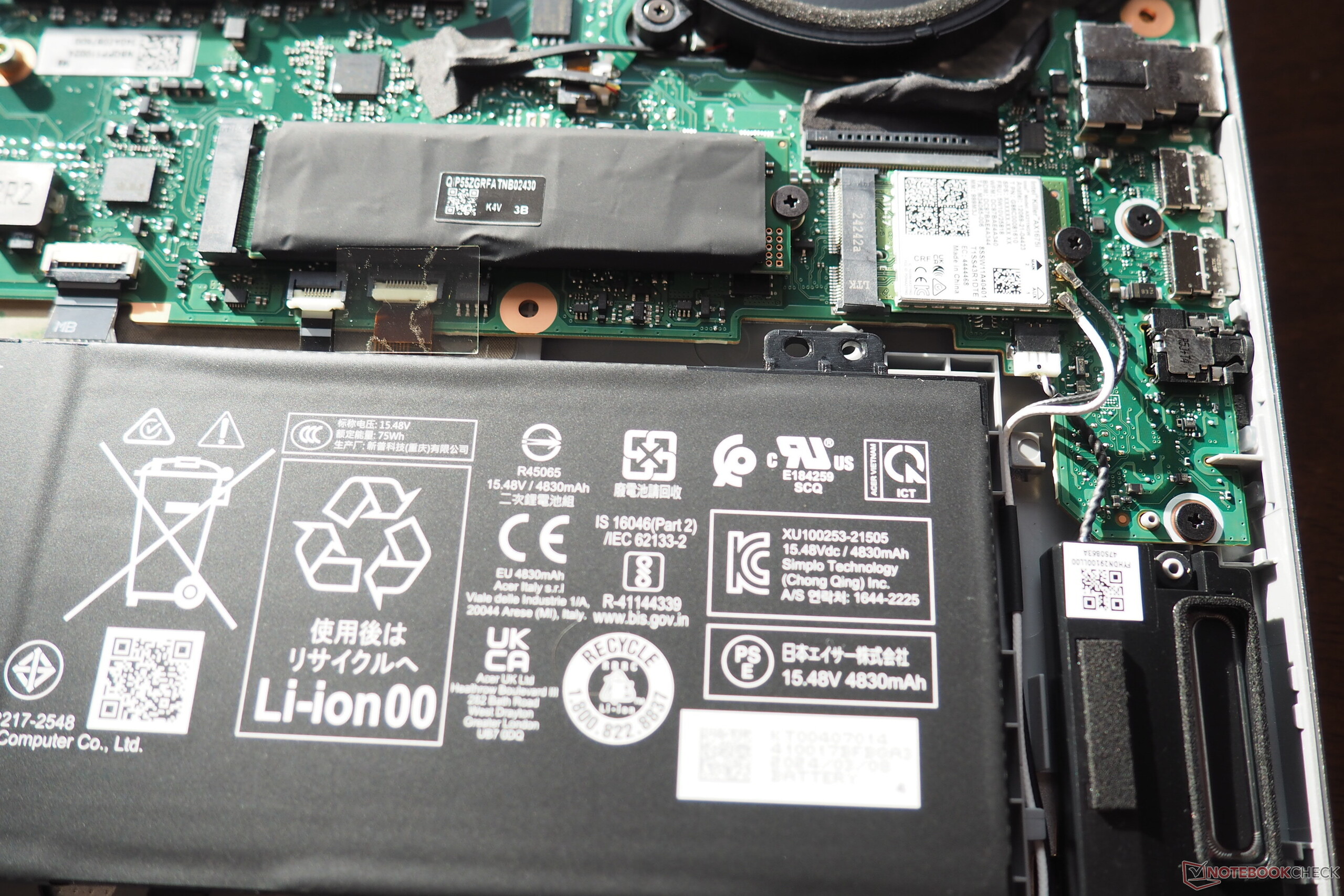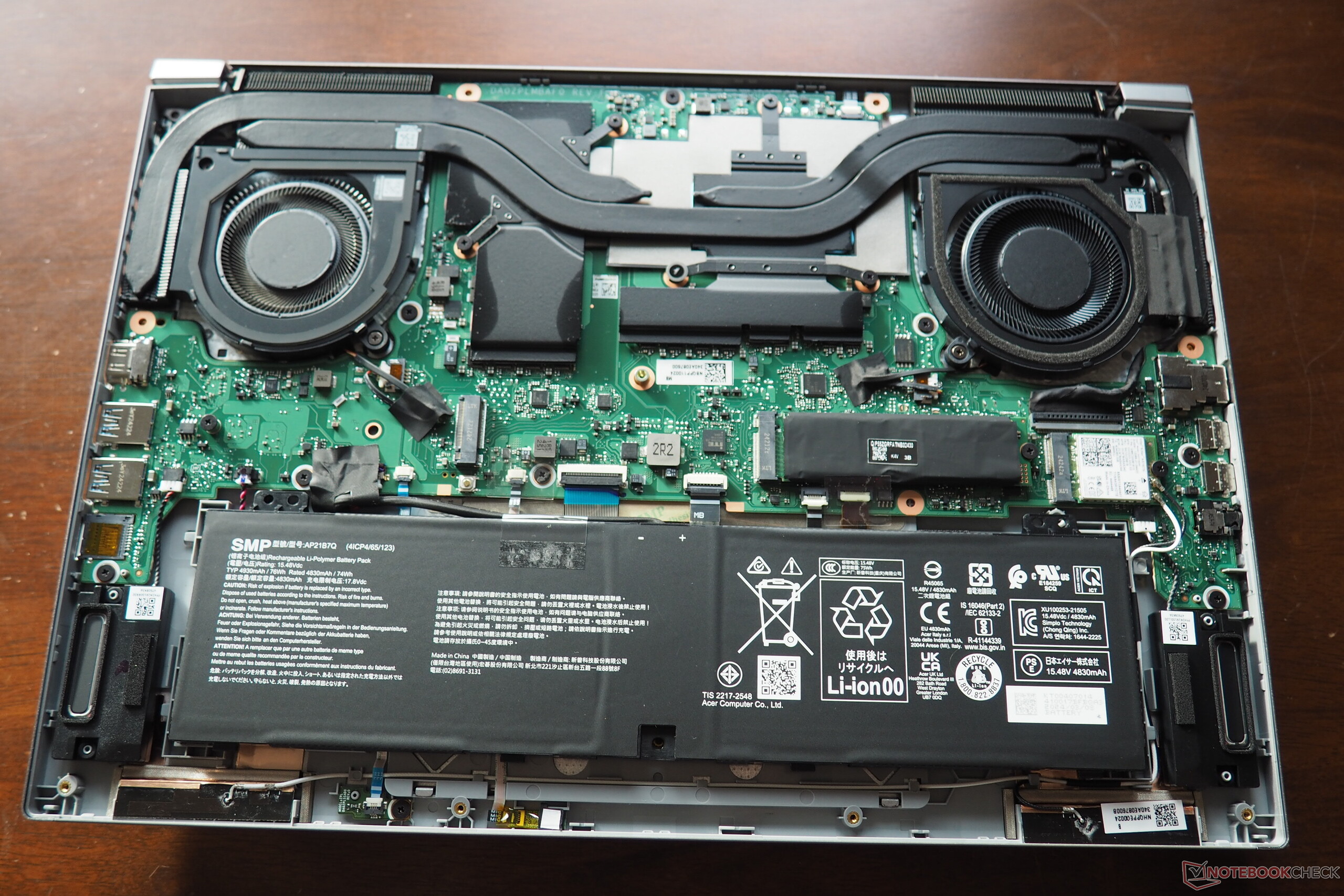The fairly tight-fitting base plate is secured with 11 Torx screws. Inside, the picture is quite tidy and straightforward. Apart from the wireless module, only the SSD and the battery can be removed. The laptop's cooling system (which, according to Acer, uses liquid metal) consists of two fans and several heat pipes.