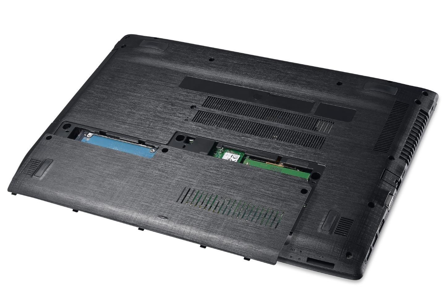 A conservative look is normally standard for laptops that are used in a professional environment. This is also true for the TravelMate. Acer relies on a completely black casing made mostly of plastic. Only the base unit's upper side is made of one piece of metal (brushed aluminum). The lid's back and the base tray are structured with a line pattern. A maintenance hatch on the laptop's bottom allows accessing the hard drive, SSD, and both working memory banks (both filled). The battery cannot be removed.