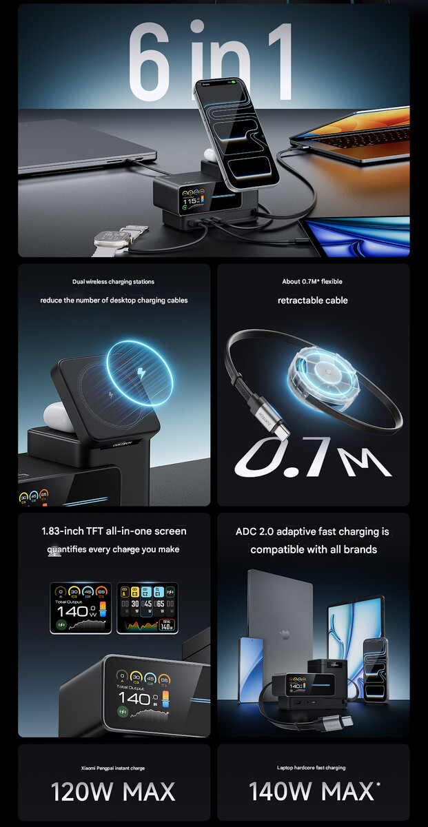 The Cuktech 15 Super Charging Station has launched in China as a new, affordable desktop charger. Among the main highlights are the dual wireless charging docks, one for accessories and one for a phone. In addition to the wireless chargers, there's a 0.7-meter built-in retractable cable and a built-in digital display.