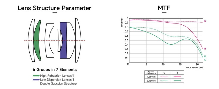 In order to make the low price tag possible, Brightin Star opts for a relatively simple lens construction with 7 elements in 6 groups and completely foregoes aspherical or apochromatically corrected lenses. As the manufacturer's MTF curves shows, the lens renders very few details at the edges of the frame at maximum aperture. The lens is only sharp in the center of the image, which should make it suitable for portraits, among other scenarios.