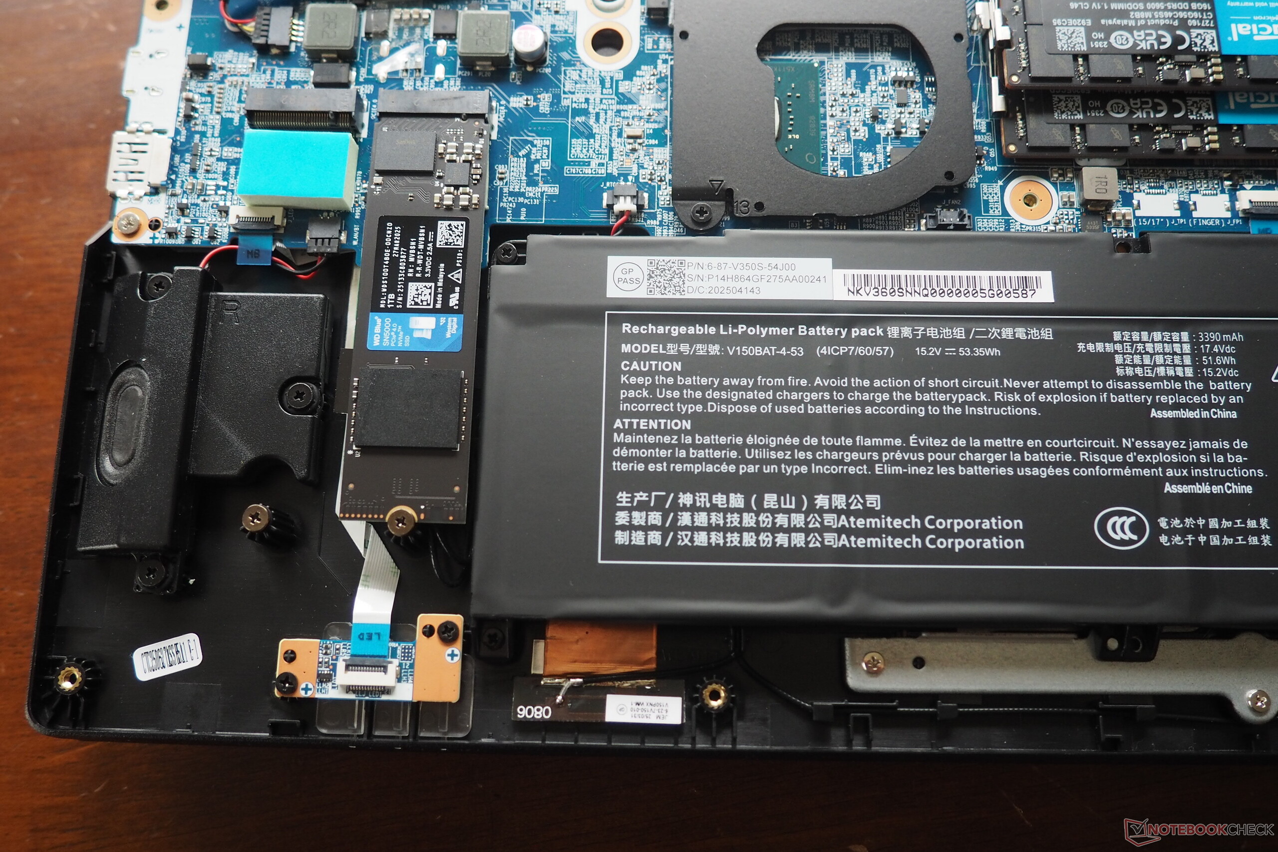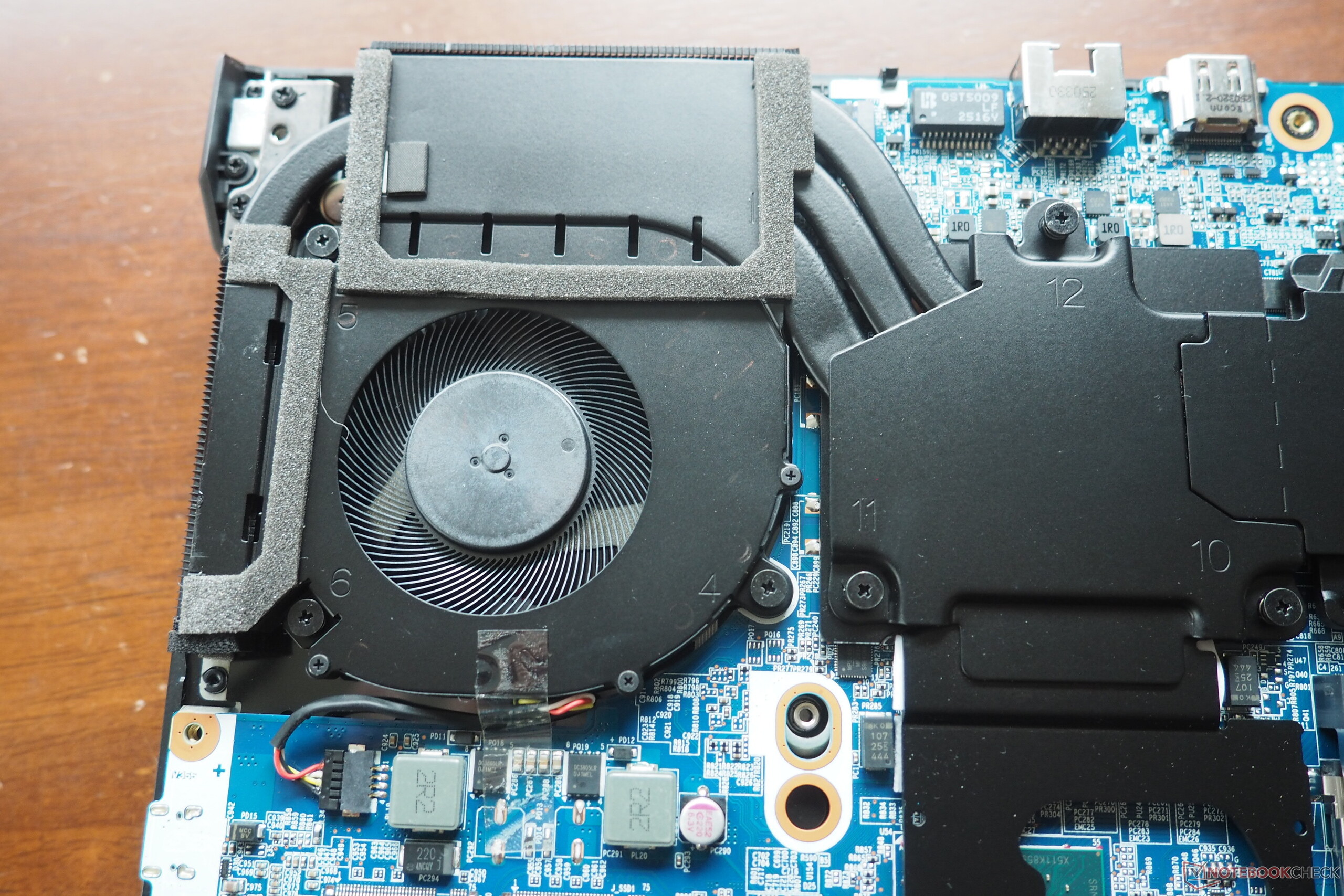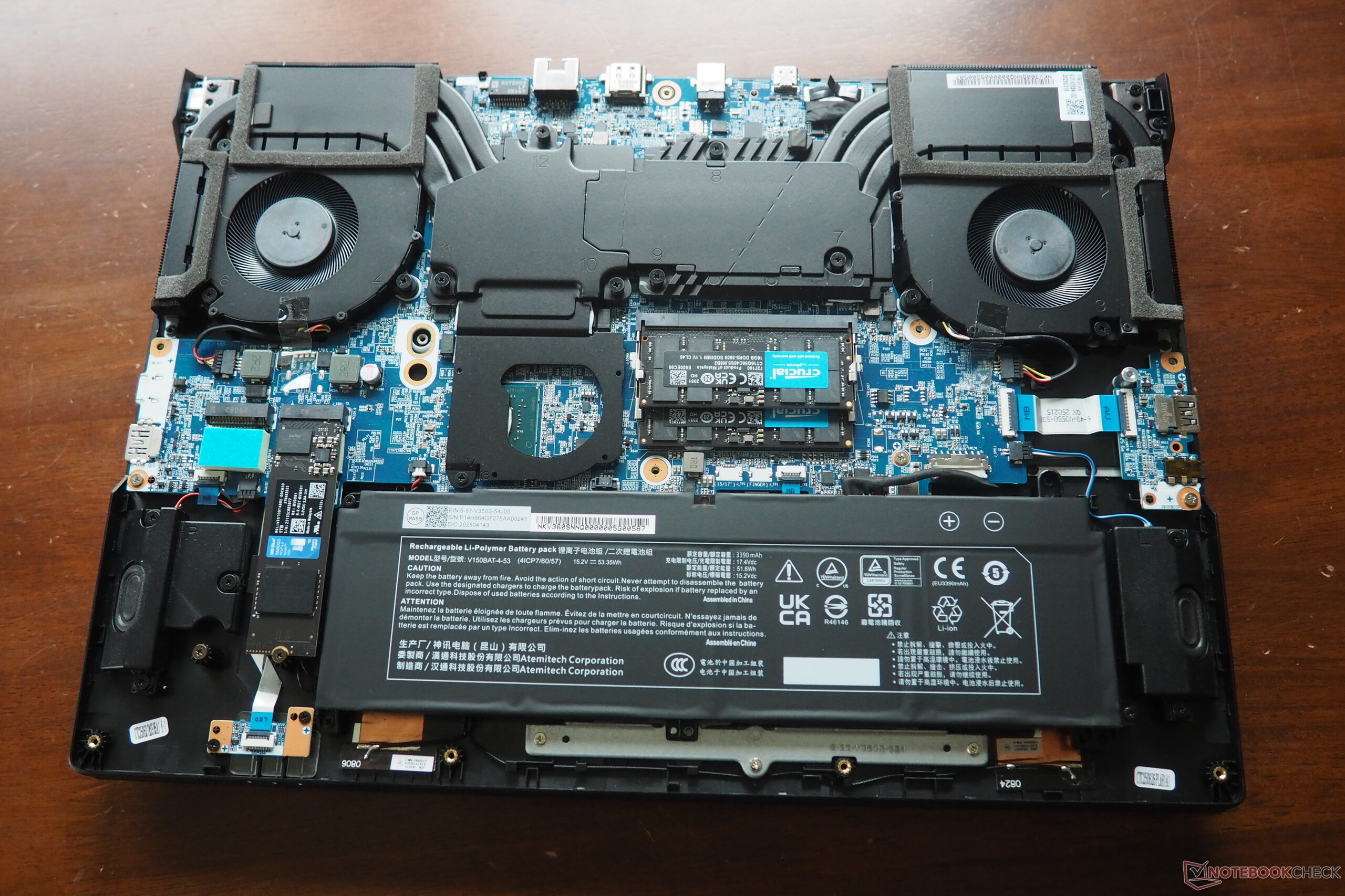 A total of twelve Phillips screws have to be removed before you can pry the bottom cover out of its mounts. Under the hood, you’ll find a cooling system with two fans, along with two RAM slots and two SSD slots. The battery is also accessible from here.