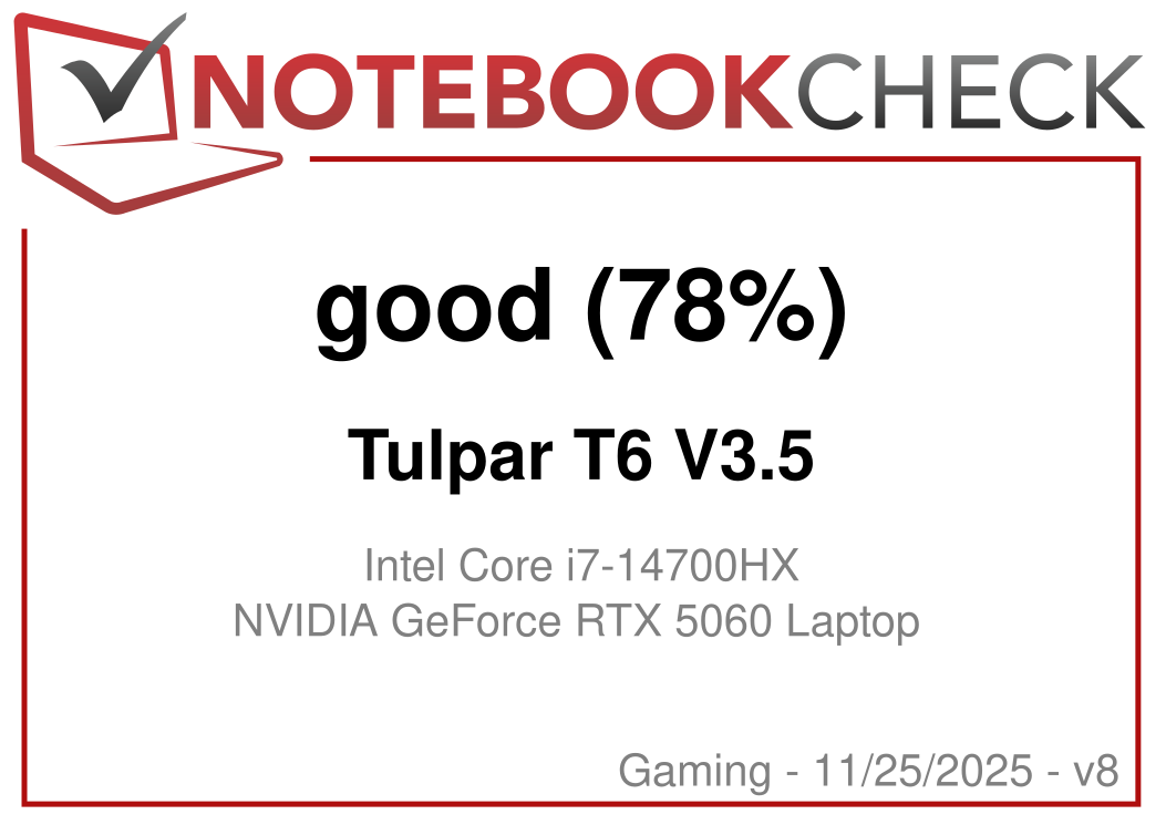 | Tulpar T6 V3.5 Intel Core i7-14700HX ⎘ NVIDIA GeForce RTX 5060 Laptop ⎘ 32 GB Memory, 1000 GB SSD | List Price: 1160 EUR | 2.4 kg | 25 mm | 16.00" 1920x1200 142 PPI IPS | |