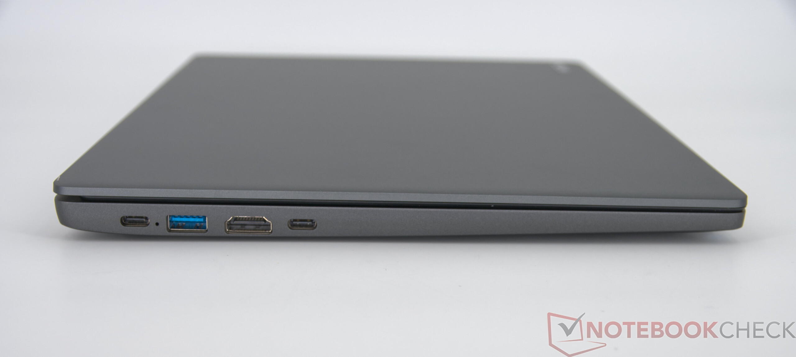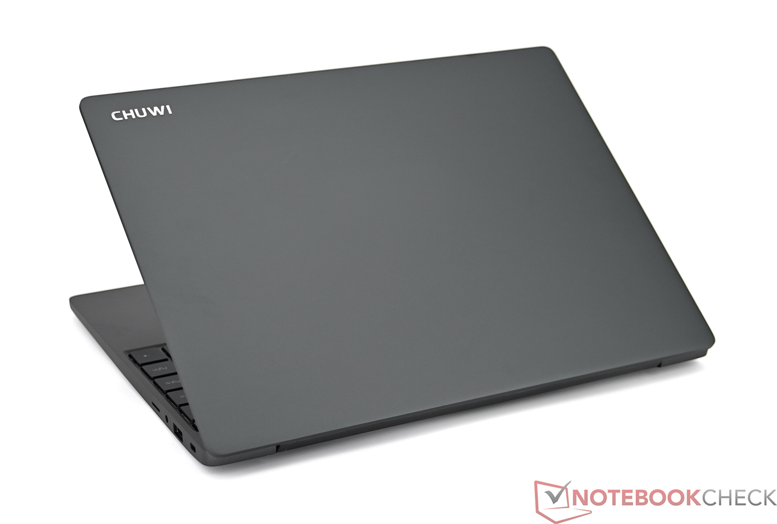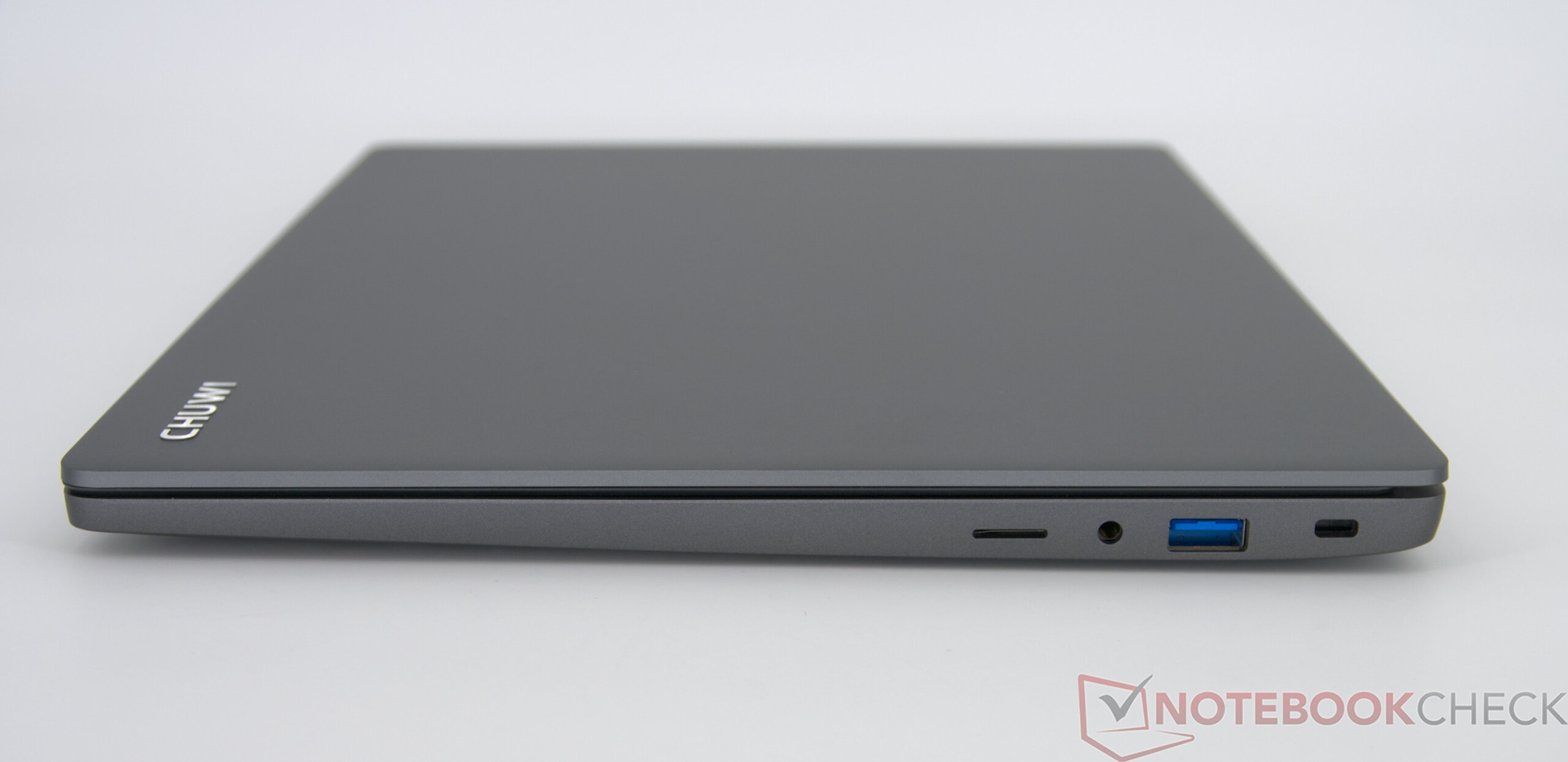The casing is strongly reminiscent of other Chuwi models and also uses a mixture of gray metal and plastic. While the surface looks high-quality from a distance, it leaves a rather delicate impression in the hand. The stability does not reach the level of premium metal devices but is still more solid than that of cheaper plastic notebooks such as the Asus VivoBook or Acer Aspire, which are priced closer to our test device. The connectivity is minimalistic, but offers the most necessary ports for everyday use.