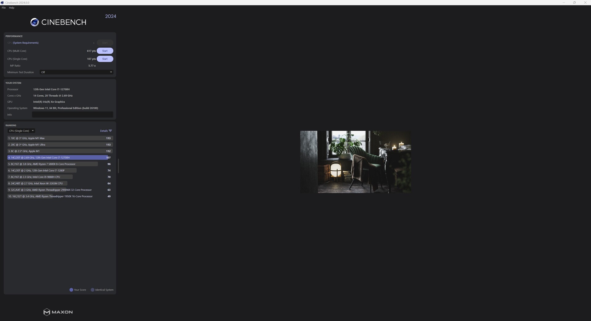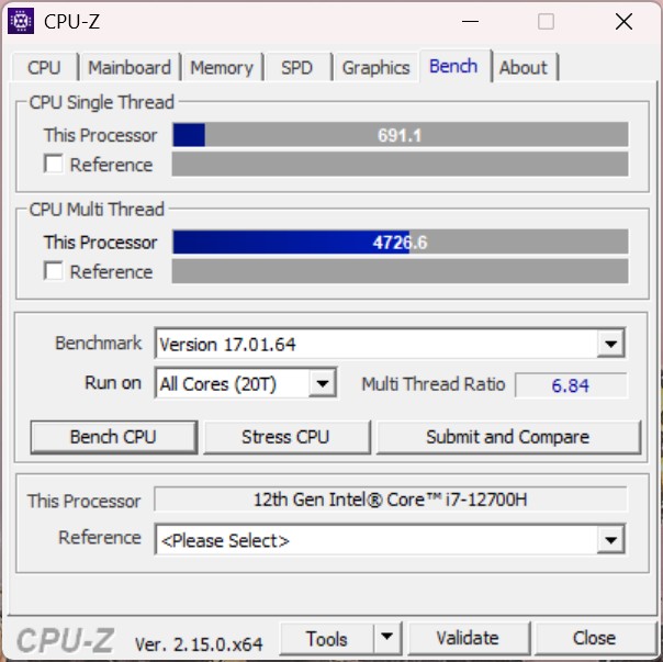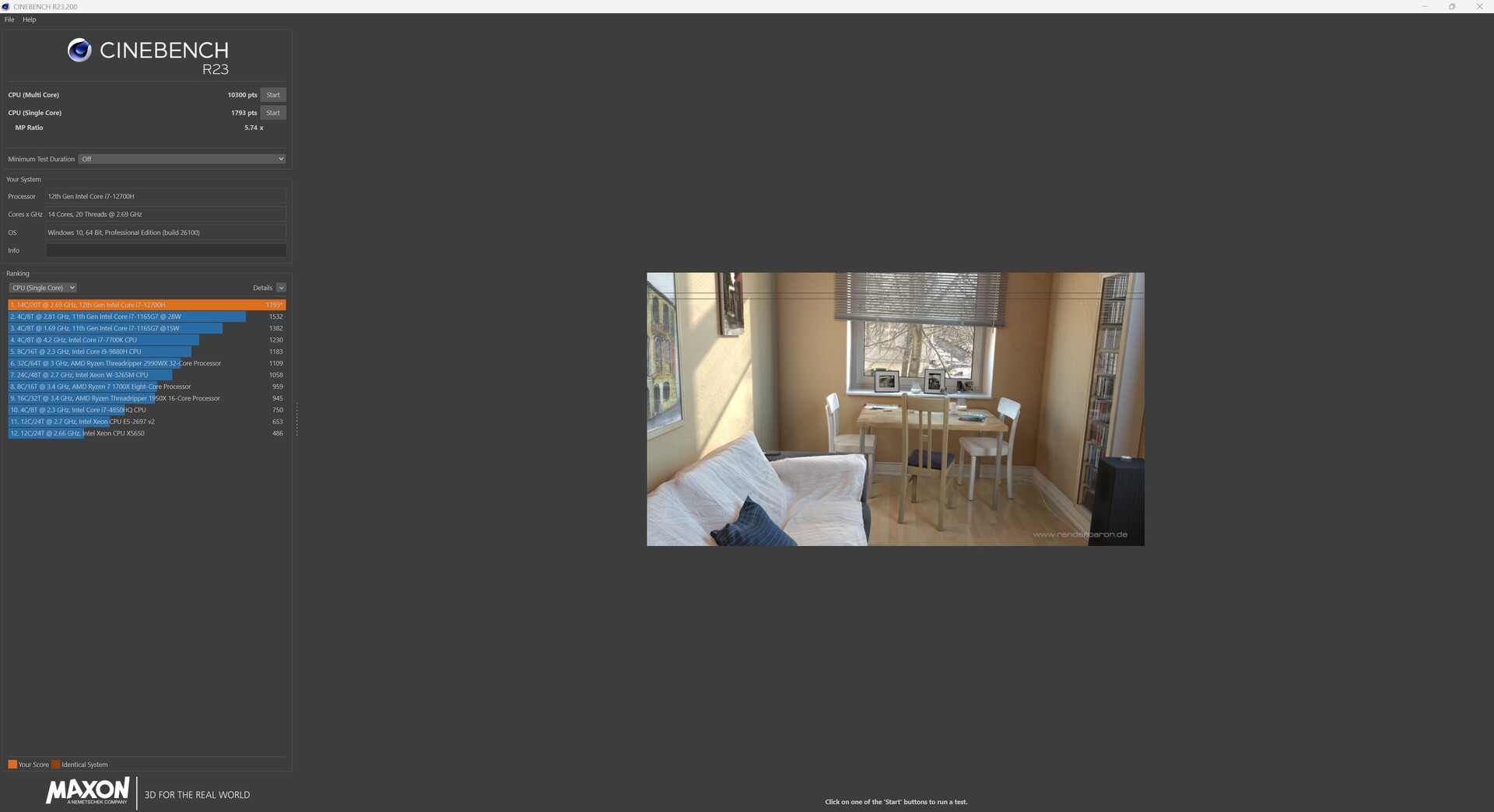 The Intel Core i7-12700H delivers solid performance with its 14 cores (6P + 8E). In terms of power consumption, the SoC only works with 35 watts, which is the minimum guaranteed performance according to Intel's specifications. This means that the processor cannot keep up with its competitors in multi-threaded tasks.
