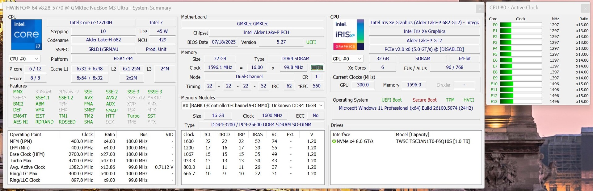 GMK NucBox M3 Ultra Intel Core i7-12700H ⎘ Intel Iris Xe Graphics G7 96EUs ⎘ 32 GB Memory, 1024 GB SSD | Amazon: $609.99 List Price: 429€ | 437 g | 106 x 114 x 42.5 mm | |
