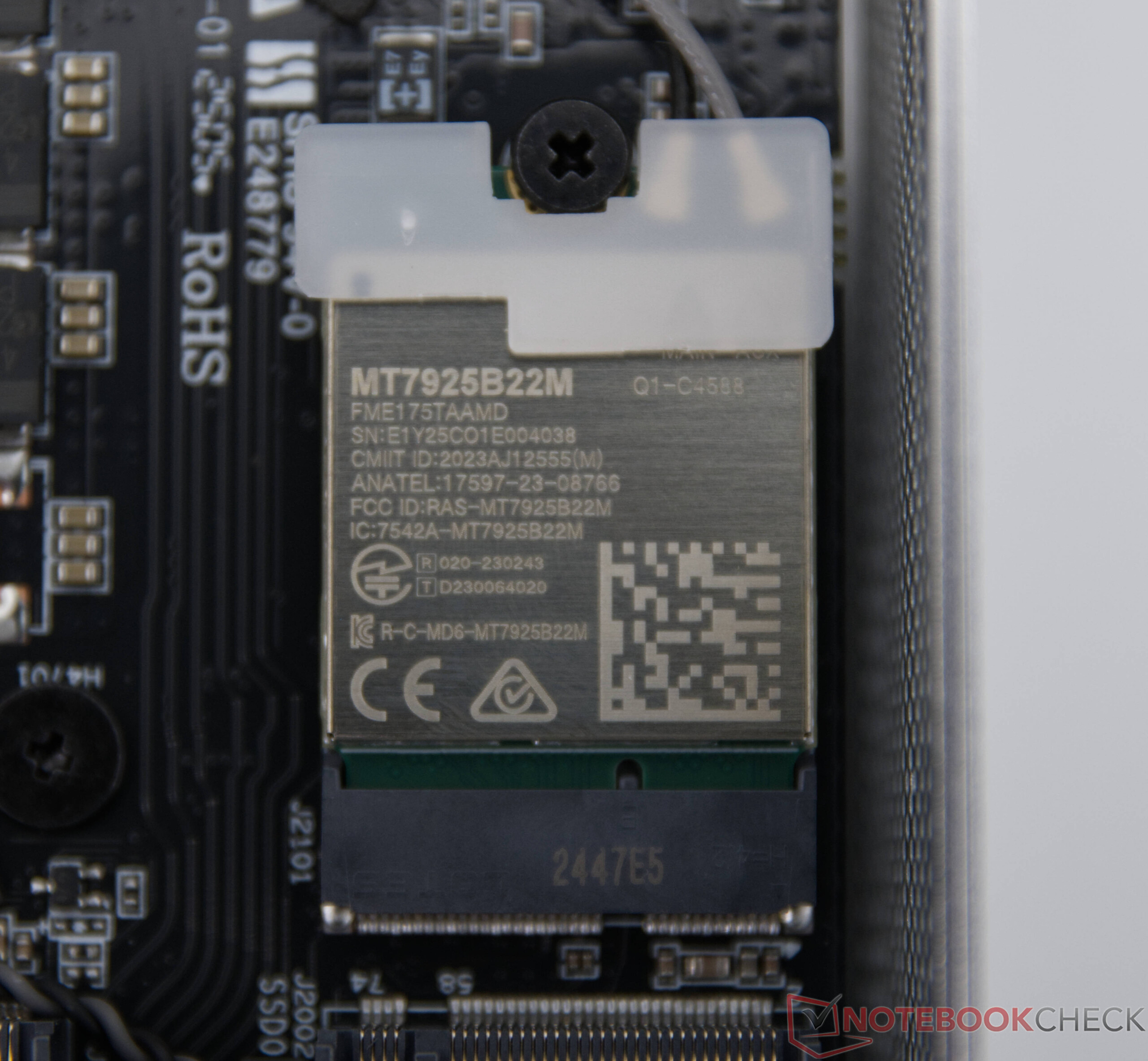 Realtek RTL8125 2.5GBe Family Ethernet Controller (10/100/1000/2500MBit/s), Mediatek MT7925B22M (a/b/g/ac = Wi-Fi 5/ax = Wi-Fi 6/ Wi-Fi 6E 6 GHz be = Wi-Fi 7), Bluetooth 5.4