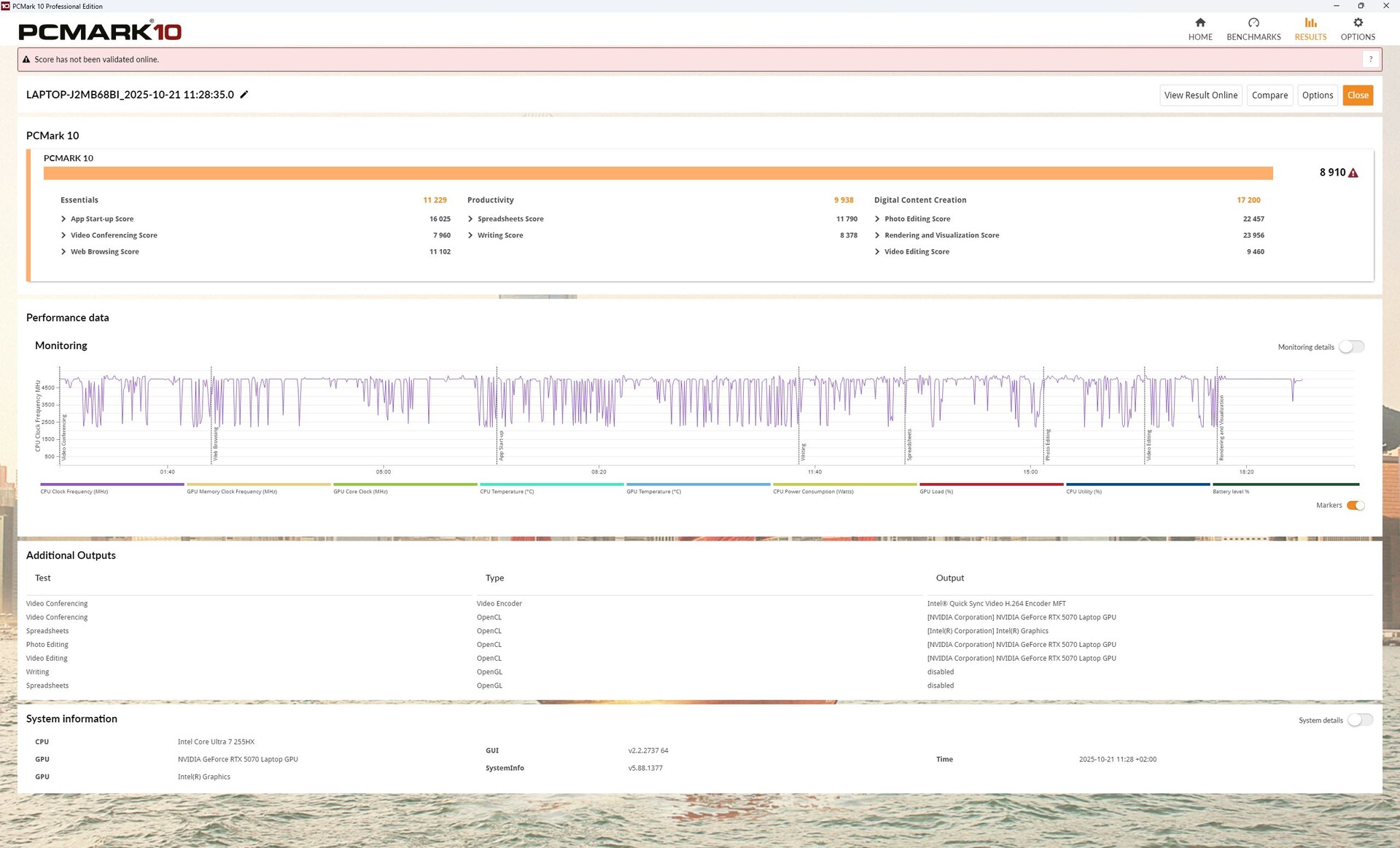 Across our CPU benchmarks, performance is above average—just a few percent behind the Ultra 9 275HX. In the Cinebench loop, it maintains stable output with only a minor (~7 %) drop over time.
