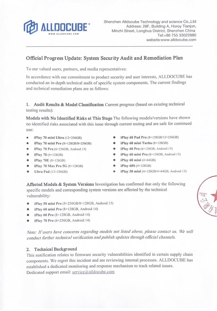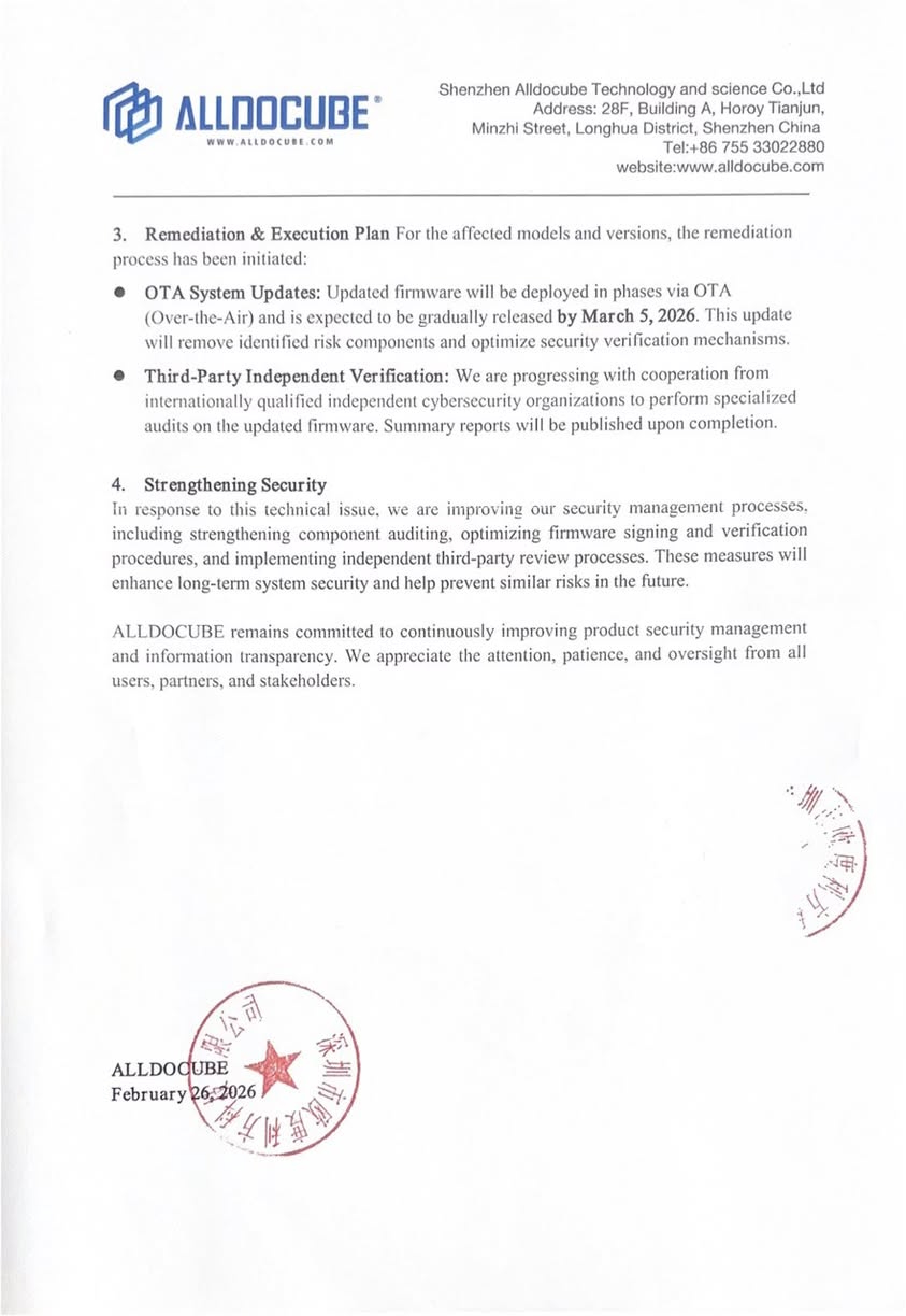 Devices which are not in any immediate danger, according to Alldocube's investigations, can be found in the above documents. Alldocube has promised OTA firmware updates by March 5, 2026 for the affected devices, and will also organize third-party audits to ensure security and safety standards of the updated firmwares.