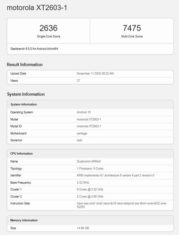 The Geekbench listing shows the phone with the model number "Motorola XT2603-1", and also with 16 GB of RAM onboard. Performance-wise, the phone earns a single-core score of 2,636 and a multi-core of 7,475. Those numbers represent computing performance slightly better than the most powerful Snapdragon 8 Gen 3 phones managed in our tests.