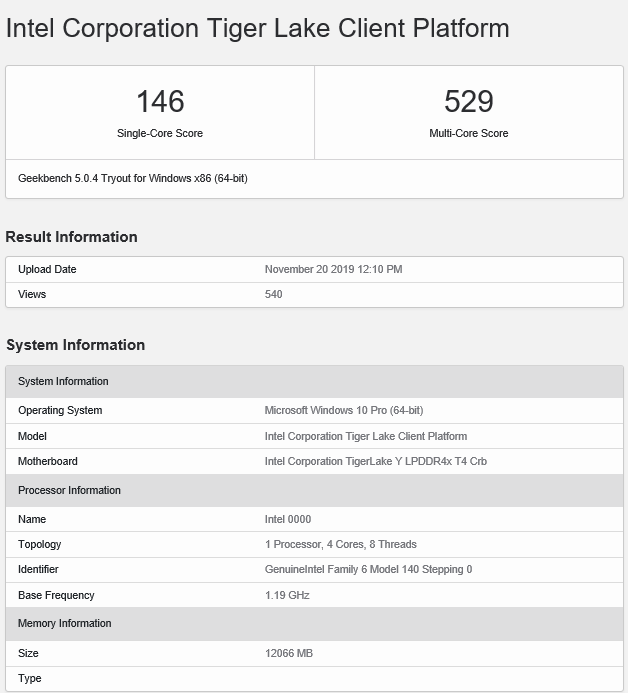 The recorded base frequency in the Geekbench entry for the Tiger Lake Y chip is 1.19 GHz. Benchmark data for Tiger Lake Y processors has appeared before, and the results have been encouraging after taking into consideration the low power requirements and increased IPC rates compared to previous generations.