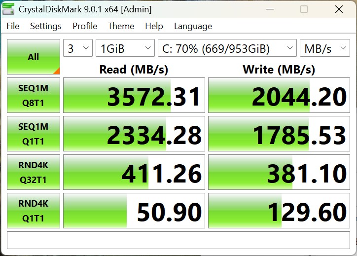 The Alliwava GH8 comes with a 1 TB SSD, the manufacturer of which is not specified. Thanks to the connection via PCIe 3.0 x4, it is not one of the fastest models and ranks in the lower end of the comparison field in terms of performance. However, the performance is sufficient for everyday tasks and the SSD also works stably under continuous load.