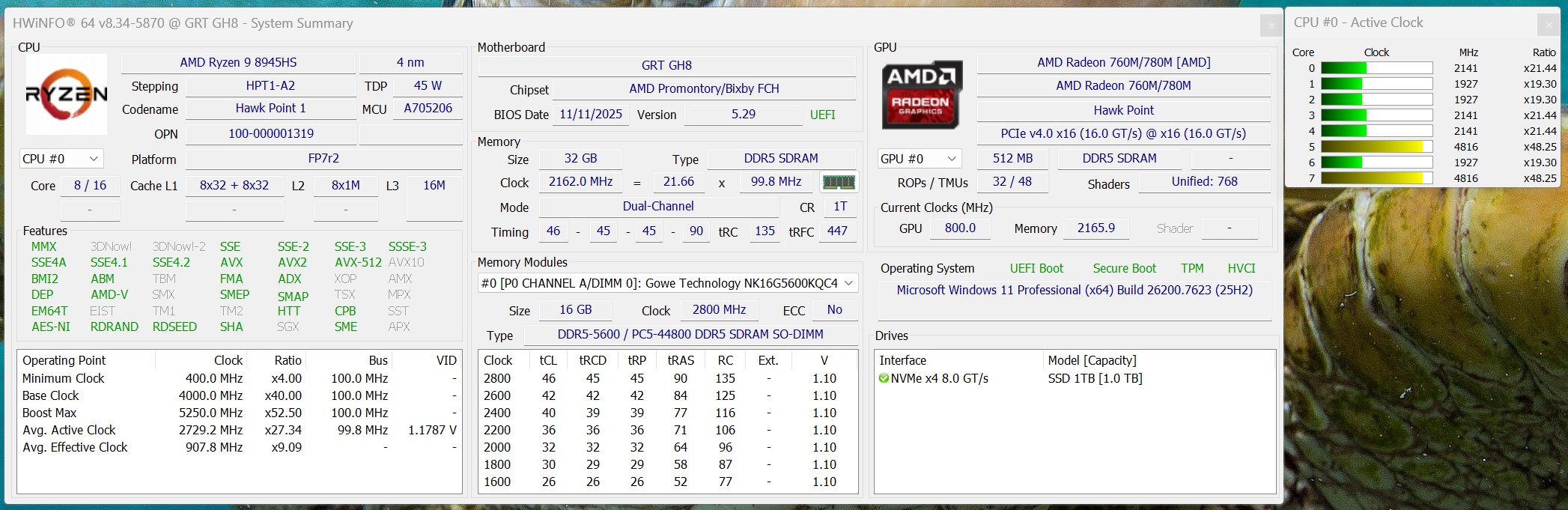 With the Alliwava GH8, the manufacturer is expanding its portfolio with a powerful mini PC that relies on modern high-end hardware despite its compact dimensions. Inside, the AMD Ryzen 9 8945HS is based on the Zen 4 architecture, which has 8 cores and 16 threads and is aimed at users. In the configuration reviewed here, the system has 32 GB of RAM and a 1 TB SSD at its disposal, creating a solid basis for balanced performance development.