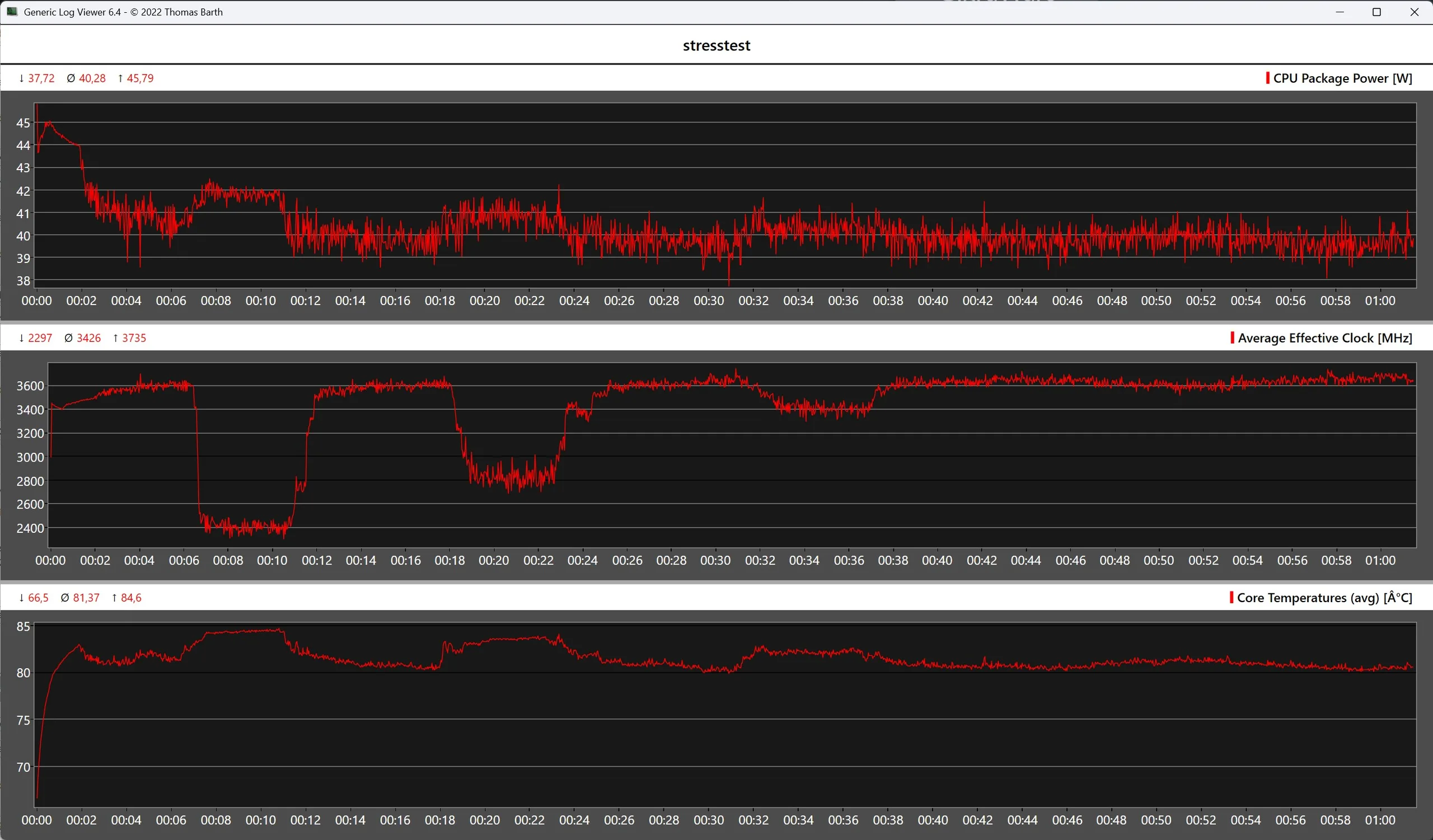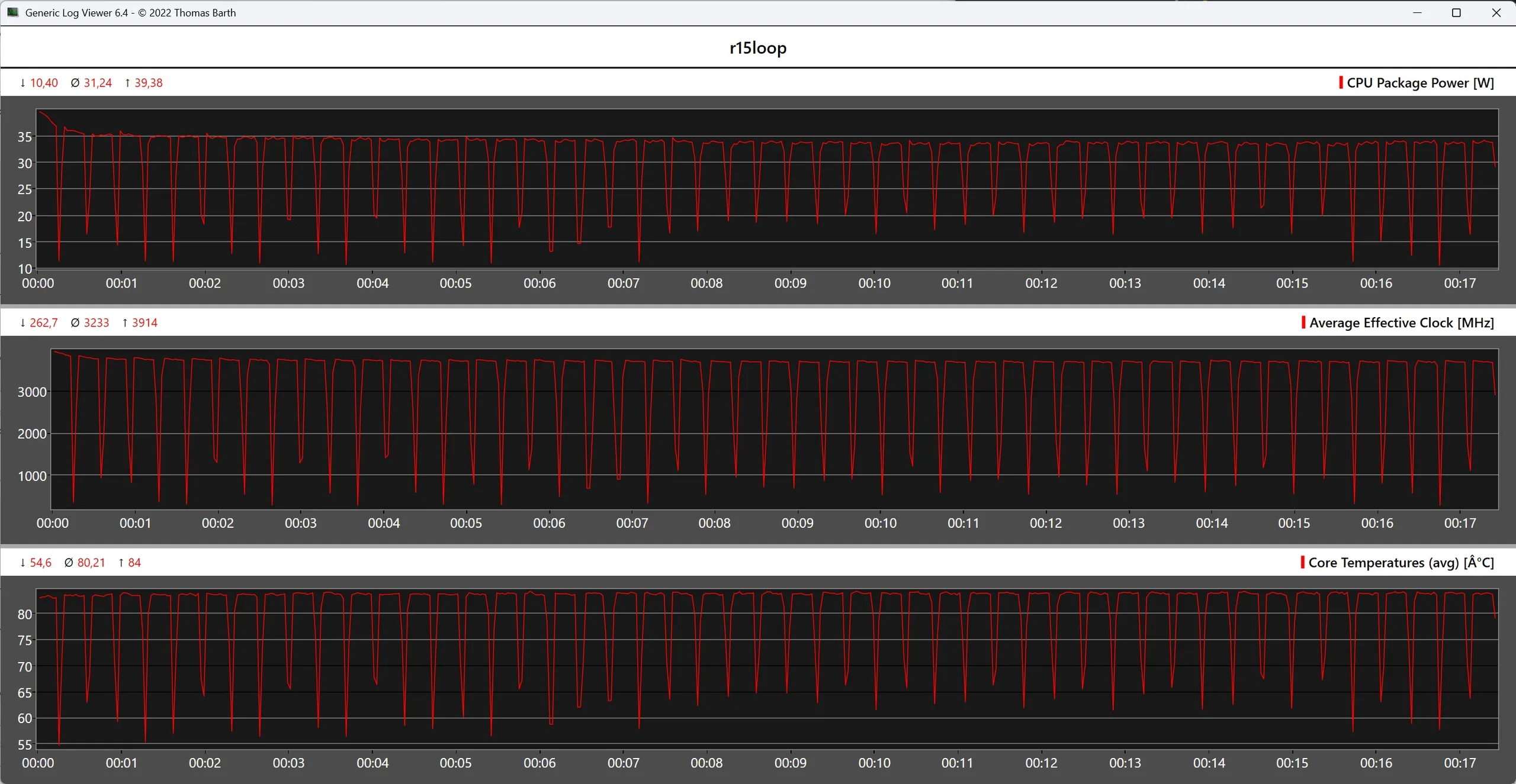 The Cinebench R15 endurance test proves that the Alliwava GH8 has a well-tuned cooling system overall. Although a slight decline in performance cannot be completely avoided under sustained load, it is moderate. The AMD Ryzen 9 8945HS briefly reaches a power consumption of up to around 40 watts, while the maximum temperature is just under 84 C.