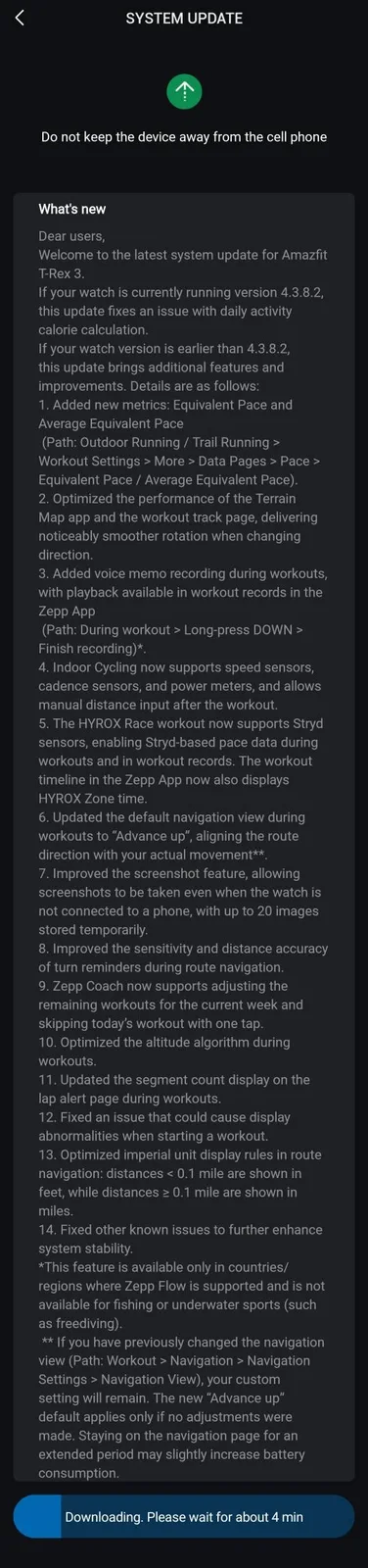 Users of the Amazfit T-Rex 3 smartwatch can now record voice memos during workouts, and the Terrain Map and workout track page have each been improved. You can find the complete change log for software version 4.3.8.4 below. It is unclear when the rollout of this new update will be complete. When it is available to you, you will be able to install this Amazfit T-Rex 3 (curr. $249.99 at Amazon) update through the Zepp app.