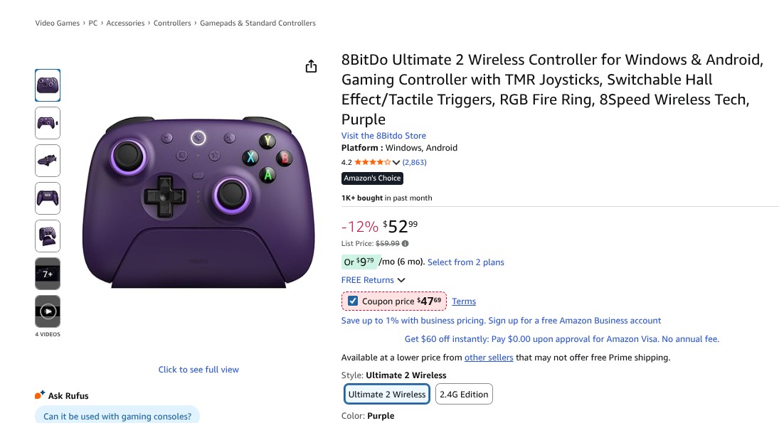Amazon currently has the 8BitDo Ultimate 2 Wireless for $52.99, a 12% discount off its original price. However, while that discount applies to the three colors available — Black, Purple, and White — buyers can score an additional 10% discount if they purchase the purple variant and tick the coupon price checkbox as shown in the image below. This brings the final price down to $47.69, which is about 30 cents cheaper than its Prime Day price. According to Amazon, the coupon expires on October 1.