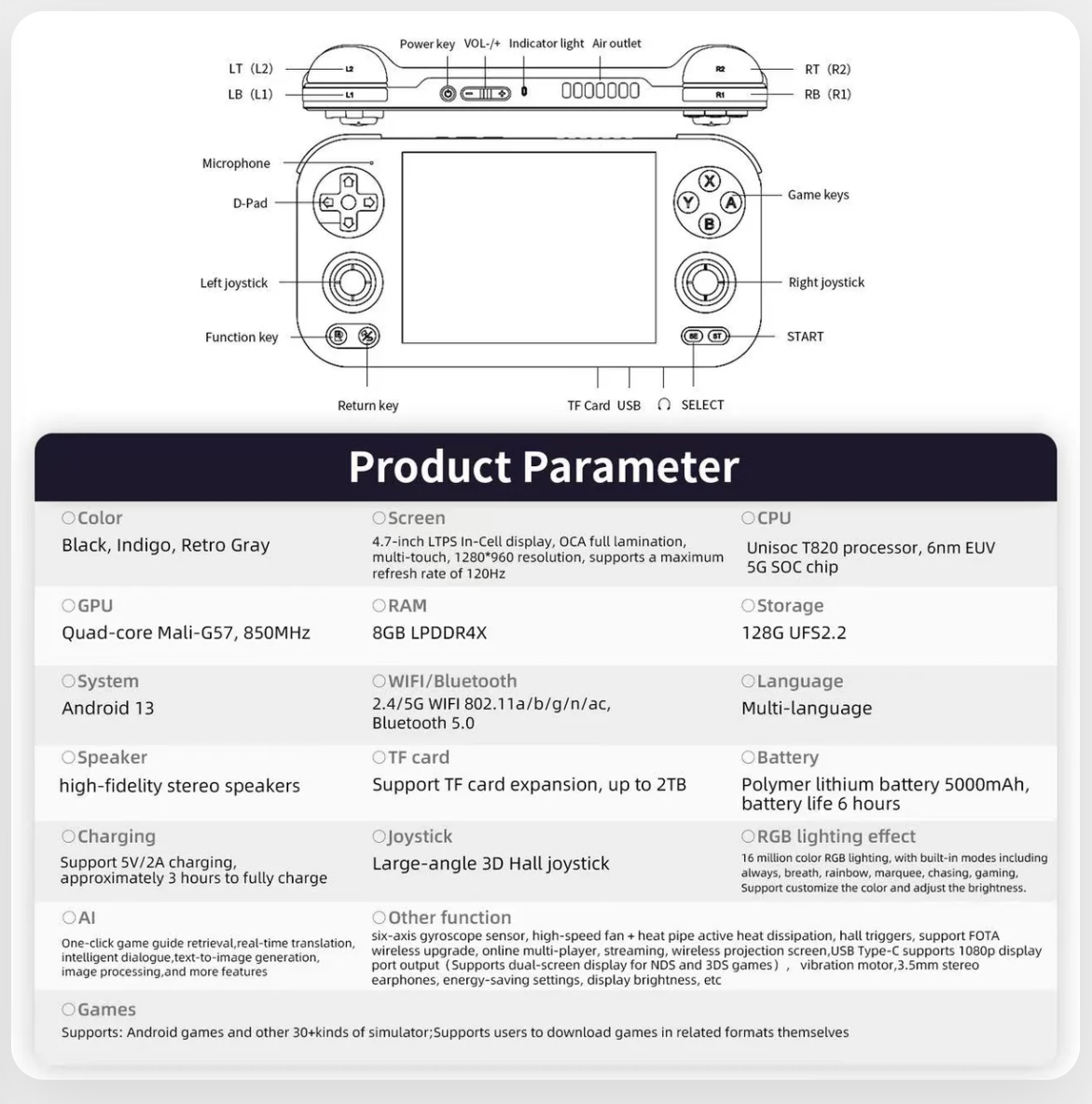 As the image below shows, the RG476H centres around a 4.7-inch IPS display supported by a 5,000 mAh battery. Not only does the display deliver a 4:3 aspect ratio and a 1,280 x 960 native resolution, but it also peaks at 500 nits with a 120 Hz refresh rate. On top of that, the RG476H features 128 GB of expandable UFS 2.2 flash storage, Hall effect joysticks and a six-axis gyroscope, all within a body that weighs 176 x 86 x 16 mm and weighs around 290 g.