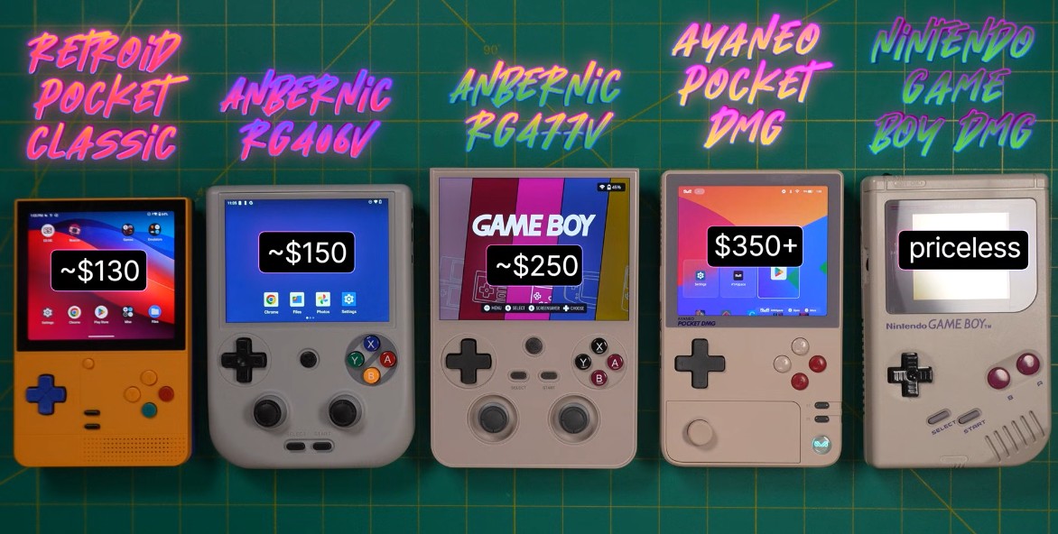 Among the early reviews of the RG477V is that of Russ of the Retro Game Corps YouTube channel. The review praises the build of the device, even calling it “probably the best vertical handheld” Anbernic has ever made. In a comparison with other vertical handhelds such as the Retroid Pocket Classic (available on Amazon for $149), Anbernic RG406V, Ayaneo Pocket DMG, and the Nintendo Game Boy DMG, the RG477V is the largest of them all. That should be no surprise, considering it has the largest display, too.