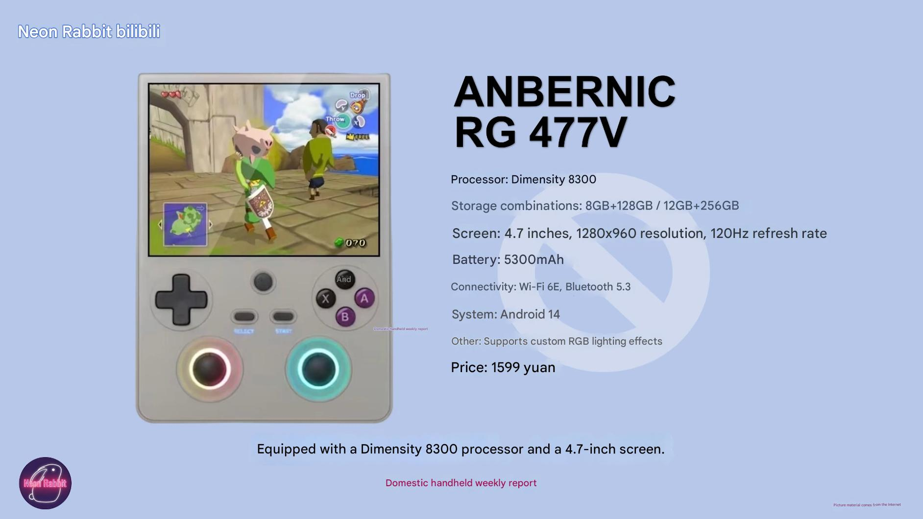 According to leaker Neon Rabbit, Anbernic is now preparing a new alternative to the existing RG406V. Posting on Bilibili, the account claims that Anbernic has created the RG477V from the guts of the existing RG477M. As such, the RG477V is said to contain a MediaTek Dimensity 8300 chipset and a 4.7-inch IPS display. Both upgrades over the hardware found in the RG406V, the RG477V will put its considerably faster chipset to use with a 960p resolution and a 120 Hz refresh rate that could be used for Black Frame Insertion (BFI) to improve CRT effects.