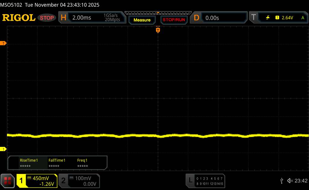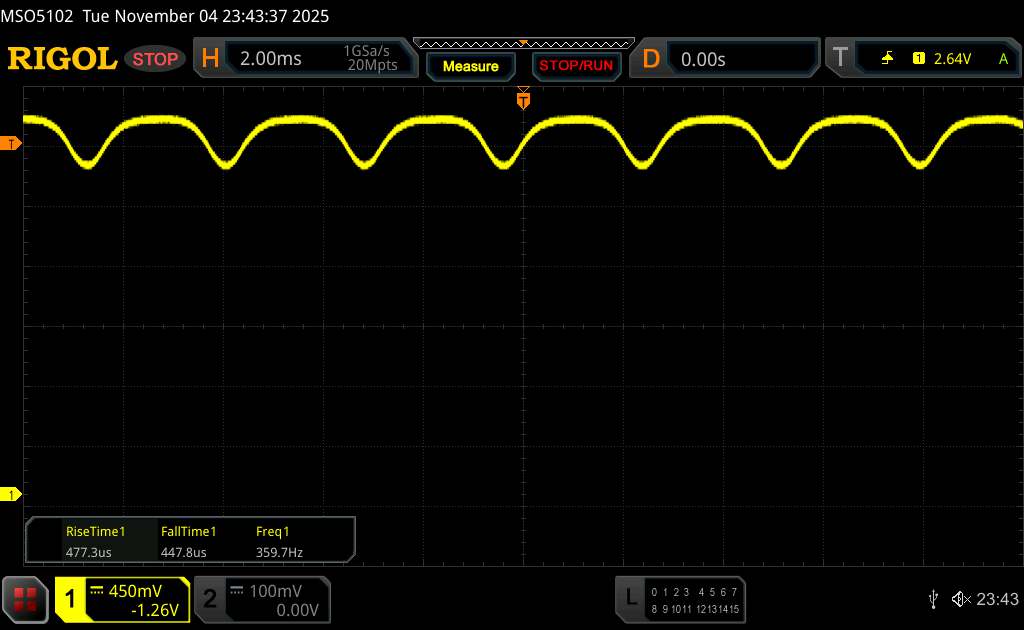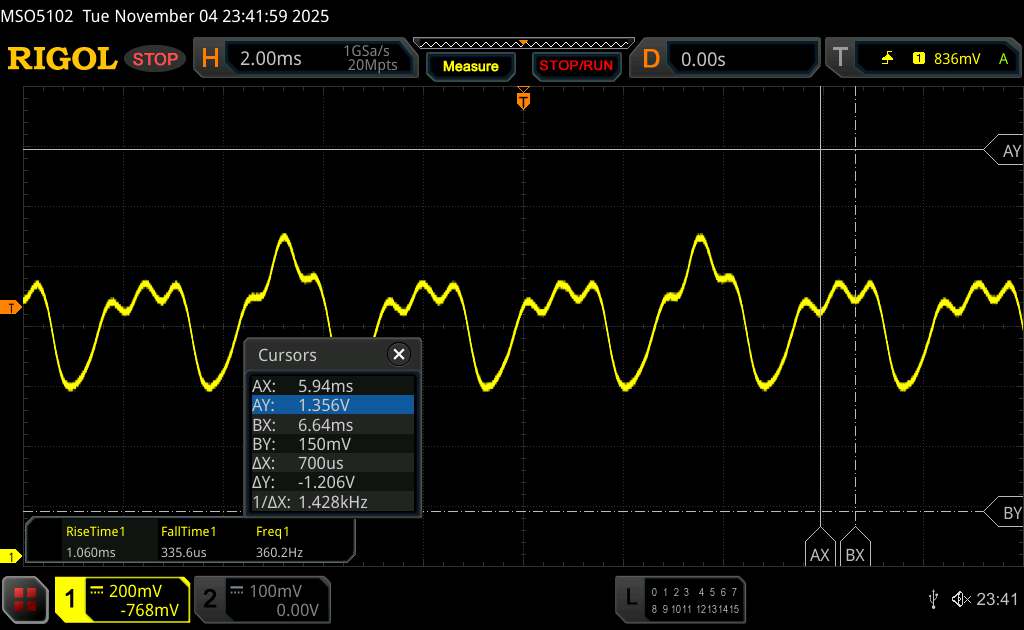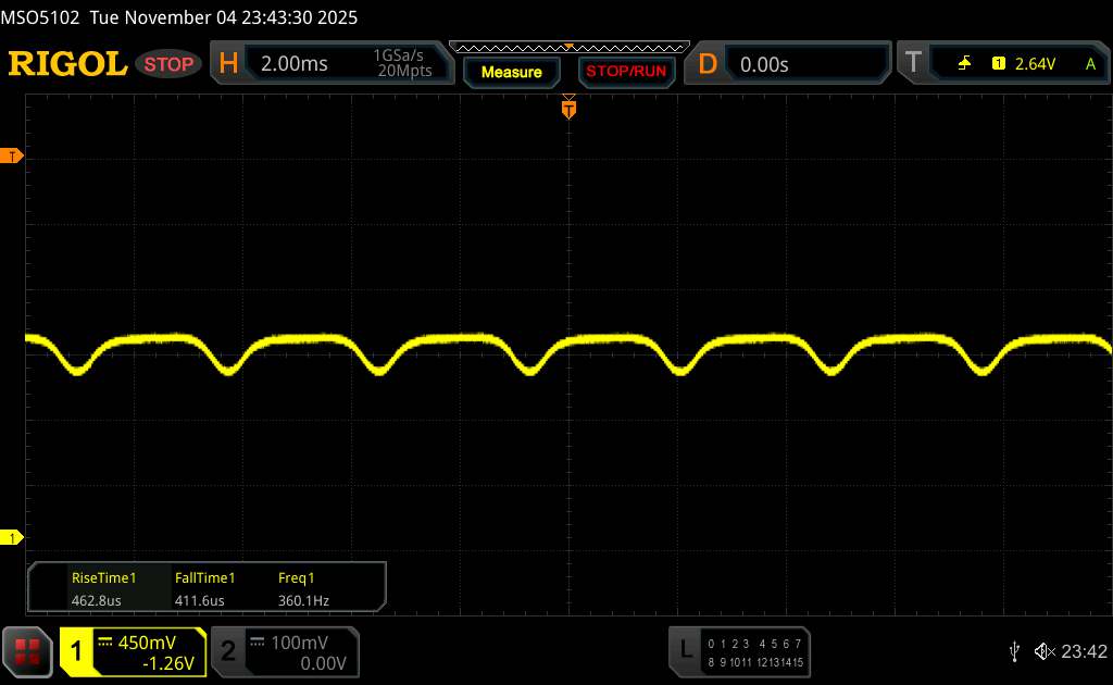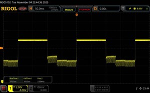The Pura 80 Pro uses pulse width modulation to control the screen brightness. According to the manufacturer, high-frequency PWM dimming at 1,440 Hz is available, which minimizes flicker-related effects. We measure a frequency very similar to that with the Rigol software.
