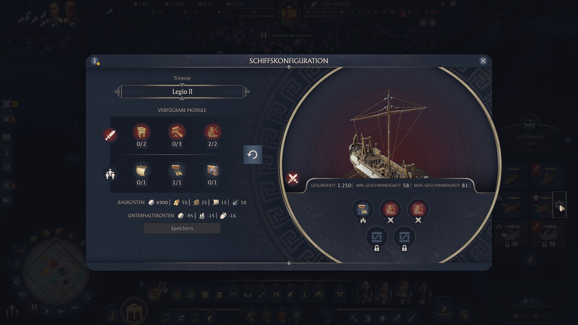 Naval combat benefits from the modular design of ships. Depending on the ship, several modules can be attached to make them more effective against buildings, for example. During our review, we were able to eliminate one of the weaker pirates and another AI praetor via land combat. Hs stronger pirate brother in Latium agreed to a truce after costly battles, but to the emperor’s disapproval. Our actions not only affect relations with other rulers but also influence our standing with the emperor, which can lead to war in the worst case.