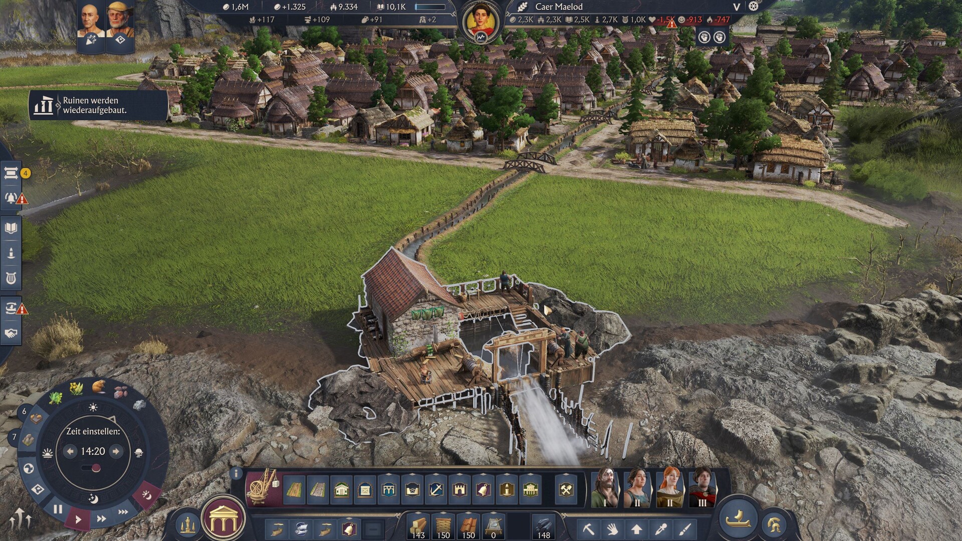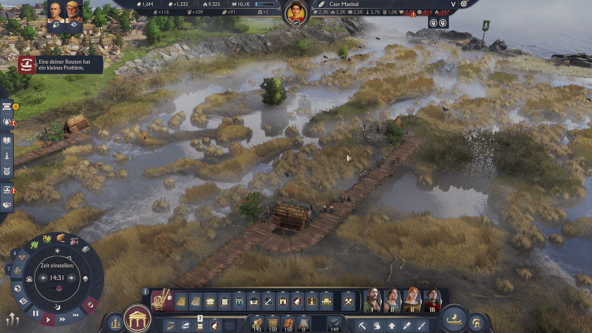 Players are immediately informed that Albion is the more challenging starting region, which we can generally confirm. However, starting in Albion is not exactly an insurmountable challenge even for beginners. That said, the swamp area involves a rather unusual gameplay mechanic. Certain goods, such as eels, can only be produced in this swamp, which can alternatively be drained thanks to researchable technologies in order to gain valuable building land, particularly in Albion.