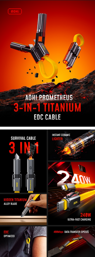 Nevertheless, Aohi asserts that all 3 functions are supported in its new Prometheus cable. One of its USB-C ends is capped with a retractable, durable "medical-grade titanium-alloy" cutting tool, while the other contains an "instant ceramic lighter".
