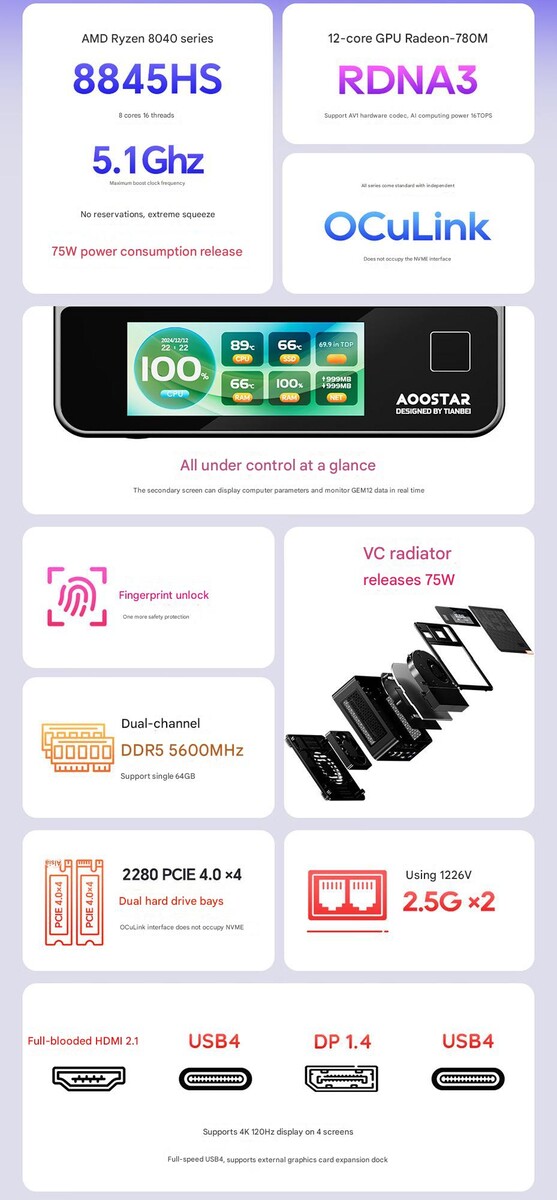 Aoostar paired the Hawk Point APU with the Glacier 3.0 cooling setup. It sports a large-sized VC cooling solution and aims to make the mini PC offer stable performance at the highest TDP mode.