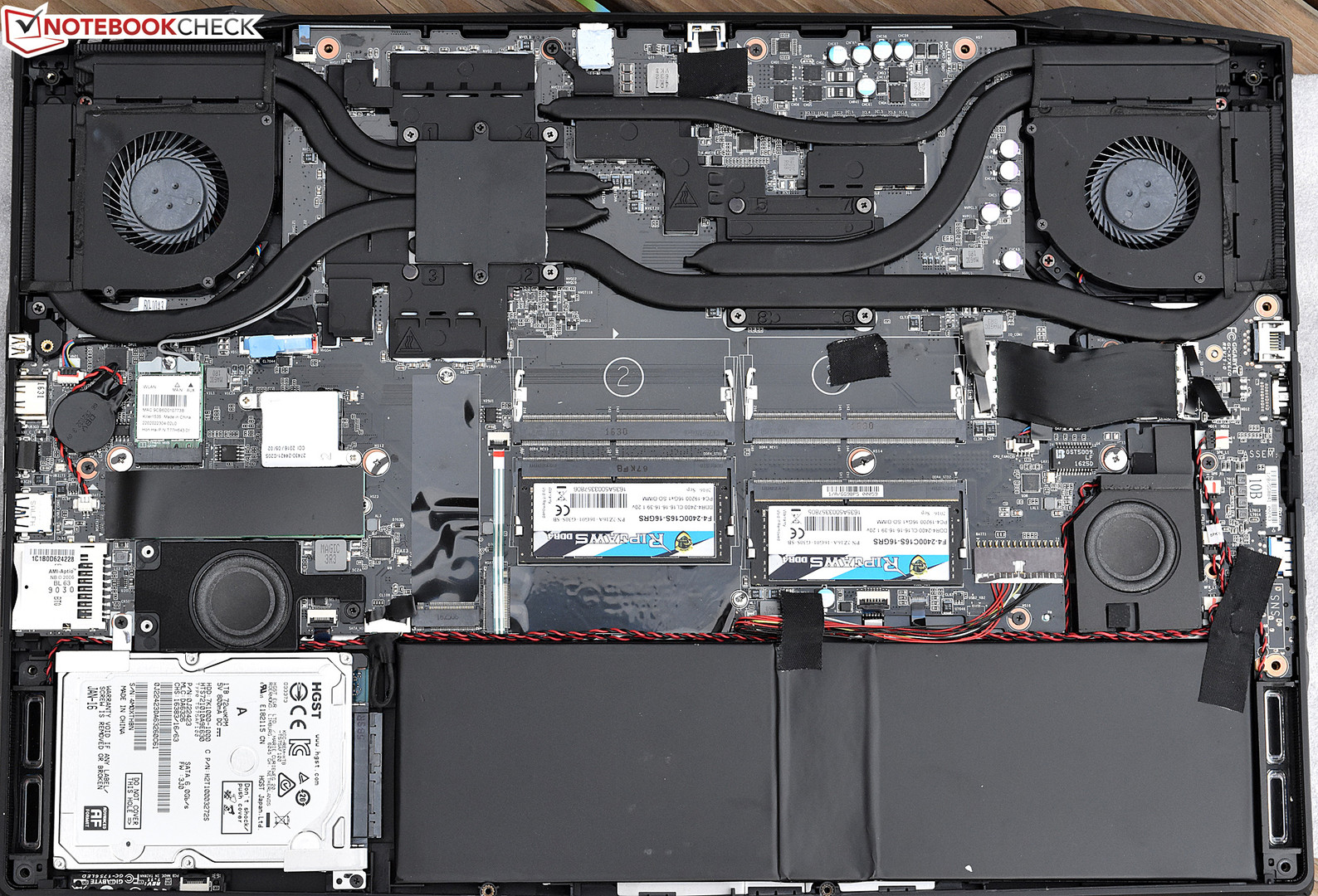 Upgrading and replacement of parts on the AORUS X7 is not too much of a trial, provided the user has a Torx screwdriver at their disposal. 12 screws secure the bottom panel to the base unit, and it is worth noting that the two center bottom screws are also covered by a thin film which seems likely to be present to indicate whether the unit has been opened by the user. Once inside, both fans are easily accessible for cleaning, and tons of replaceable parts and ports are available: two M.2 2280 SSD ports (one of which was populated on our review configuration), a 2.5-inch 7mm drive bay (also populated), four (4) RAM slots for DDR4 SODIMMs (2 populated), the WLAN adapter, CMOS battery, and finally, the internal system battery.