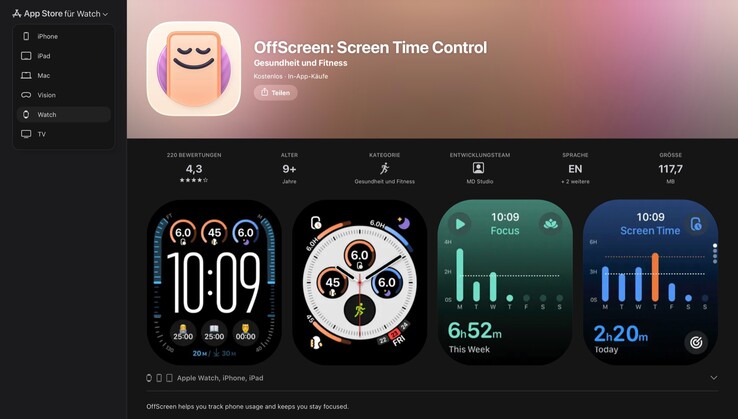 A button in the upper left corner of the screen allows you to quickly switch between all Apple platforms, which is convenient for browsing through the available software for the Apple Watch, Apple TV 4K or Apple Vision Pro before purchasing the corresponding product.