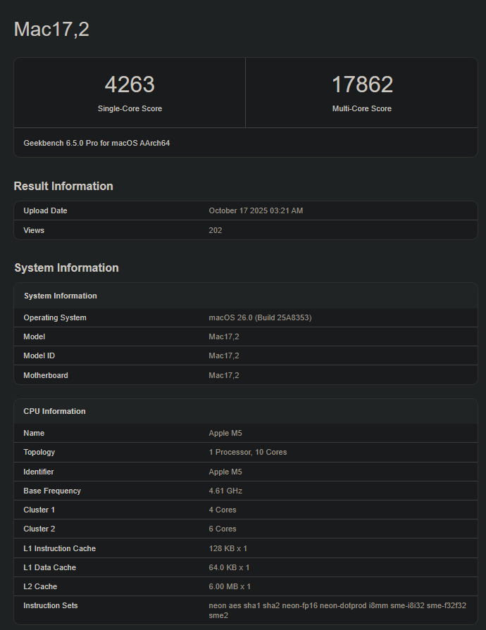 It scores 4,263 in Geekbench's single-core test, effectively making the Apple M5 about 13% faster than the Apple M4 (3,748 average). In multi-core, the M5 scores 17,862 points; a 17% increase over its last-gen counterpart (15,173 points).