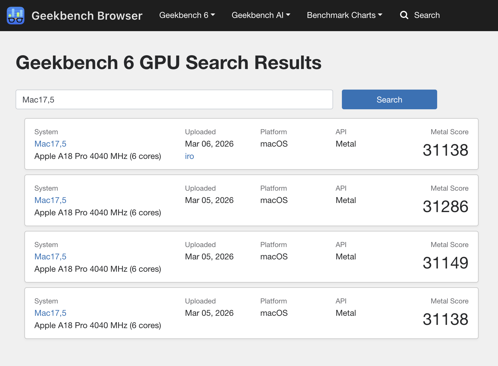 On the one hand, GPU performance appears to be slightly ahead of the M1-powered MacBook Air that we reviewed in 2020. At the time, that device averaged 30,112 in the Geekbench 6.5 Metal benchmark. Meanwhile, the MacBook Neo returns 31,178 from the benchmarks that have been listed so far. That result comes up around 5.7% short of the iPhone 16 Pro Max despite containing 16.6% fewer GPU cores.