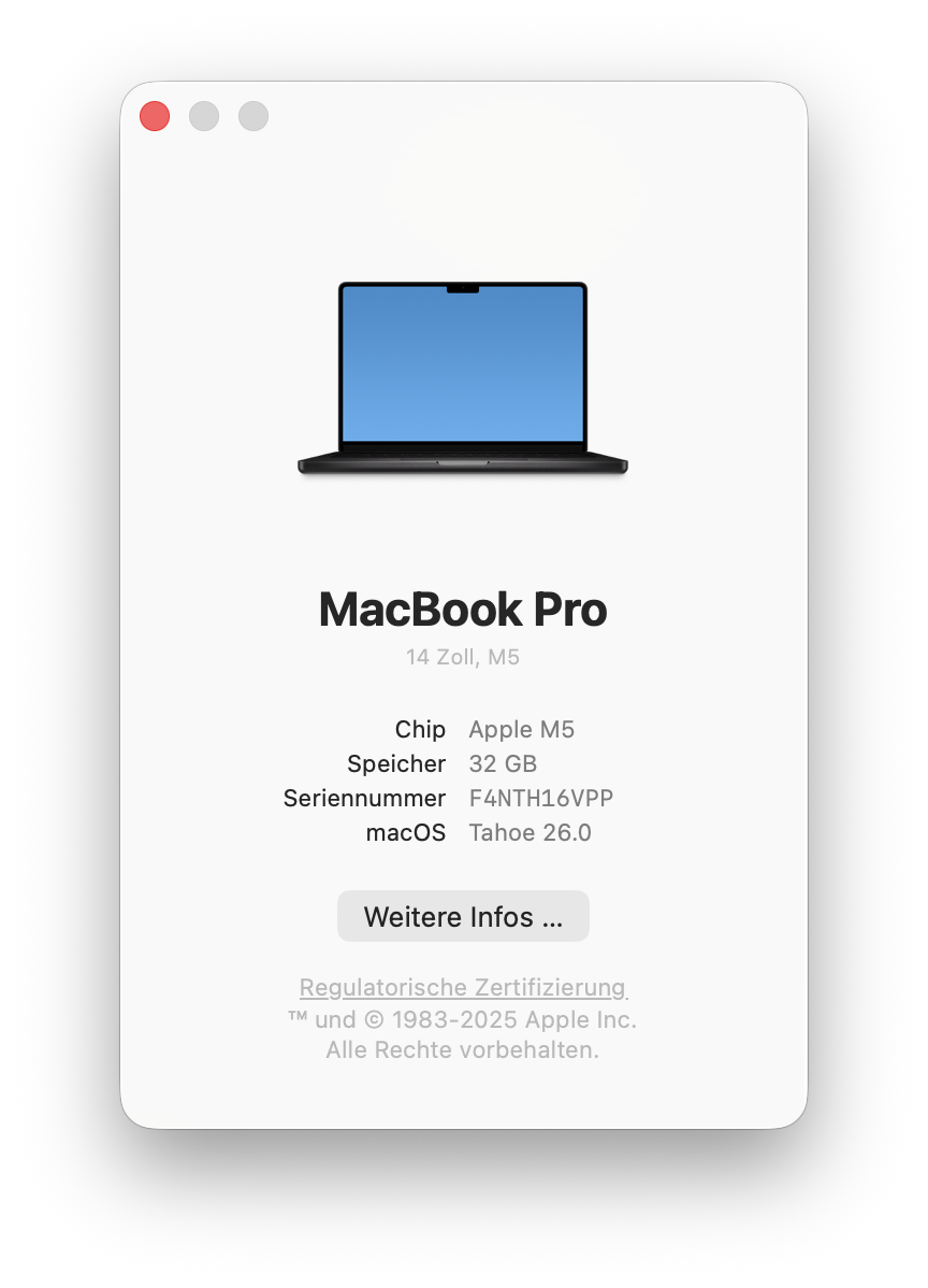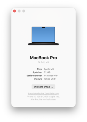 Apple MacBook Pro 14 2025 M5 Apple M5 (10 Cores) ⎘ Apple M5 GPU ⎘ 32 GB Memory, 1024 GB SSD | Amazon: 1. $1,999.00 Apple 2025 MacBook Pro Lapto... 2. $2,189.13 Apple 2024 MacBook Pro Lapto... 3. $1,750.93 Apple 2024 MacBook Pro Lapto... List Price: 2739€ | 1.5 kg | 15.5 mm | 14.20" 3024x1964 254 PPI Mini-LED | |