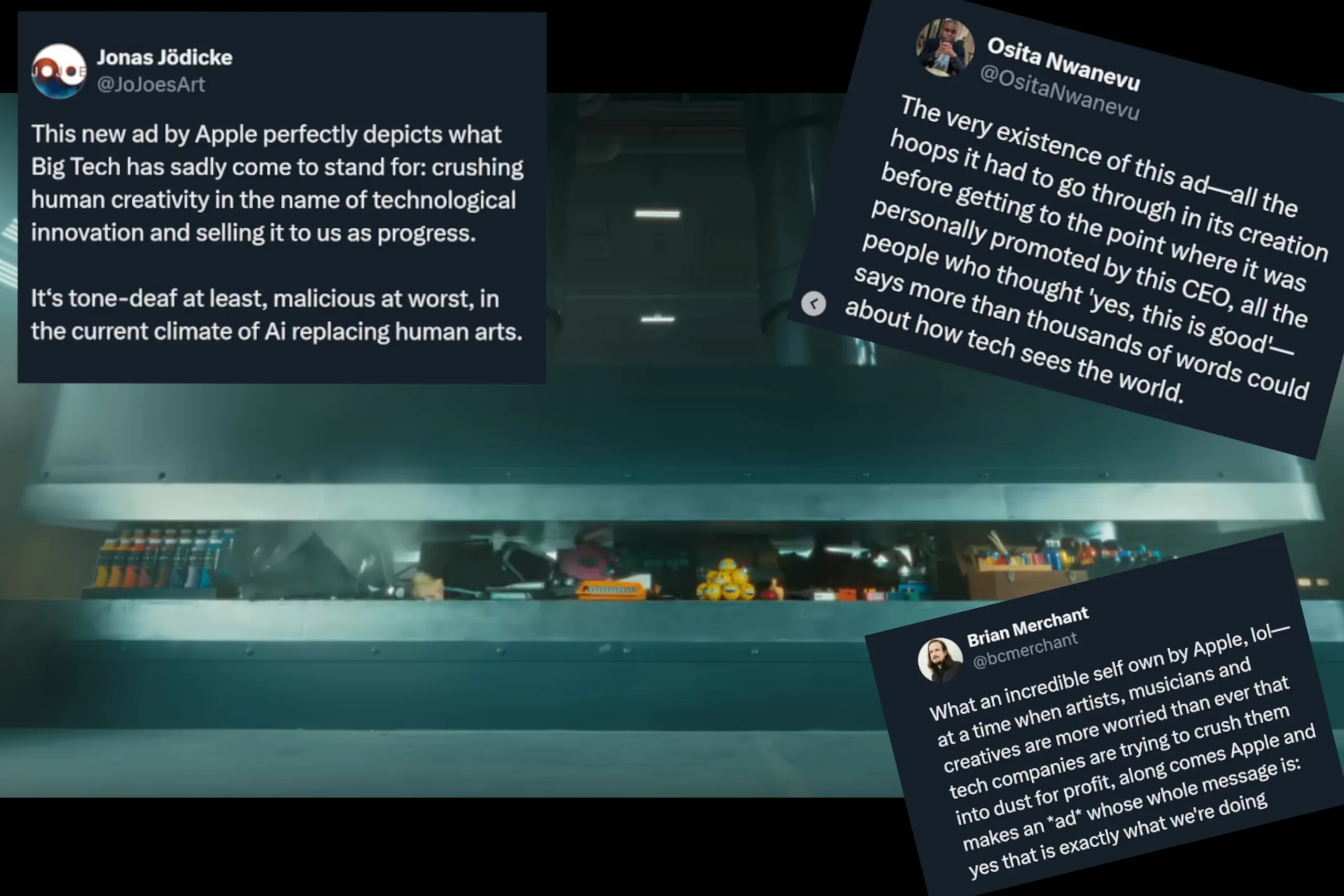 In light of the recent movement in the tech industry towards replacing artists with generative AI, Apple's ad was, somewhat understandably, poorly received by the very same artistic community Apple is targetting with the iPad Pro. In a statement to AdAge, Apple's VP of marketing apologised for the ad, stating: