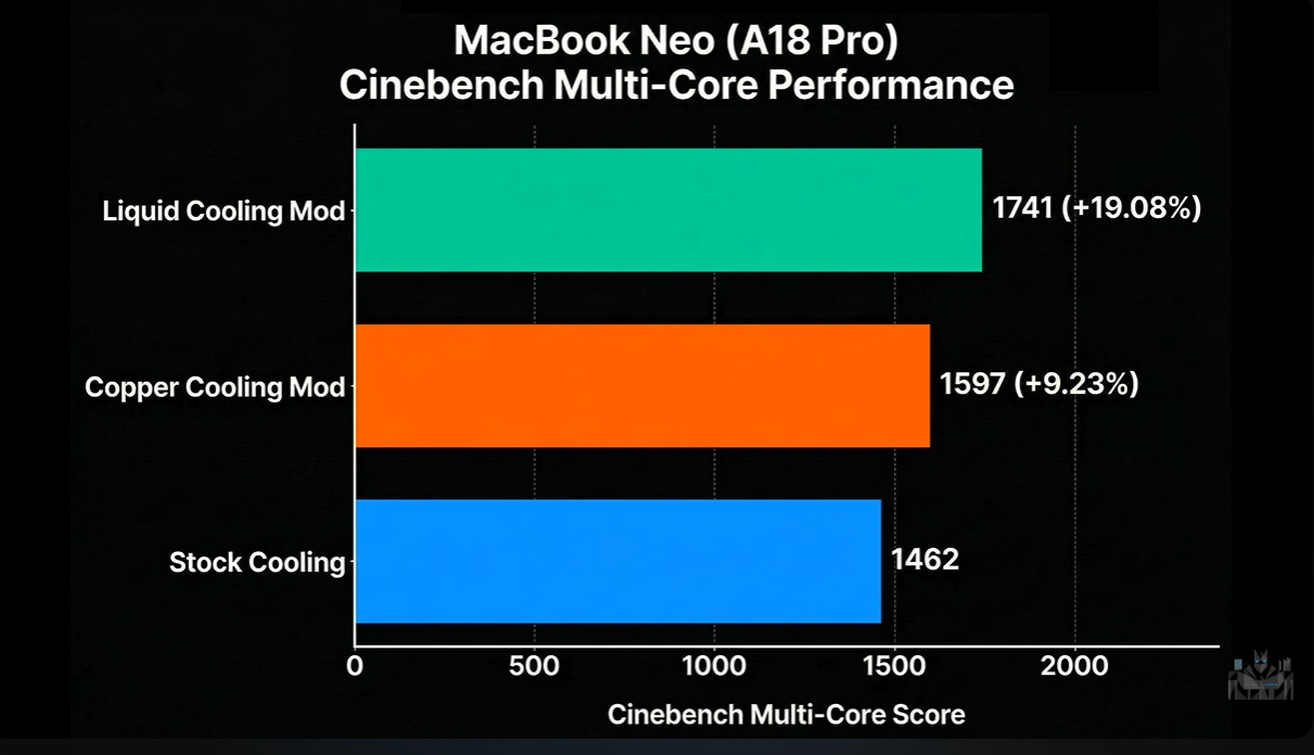 ETA Prime also tested a thermoelectric water cooler to see how much better the MacBook Neo can perform. The thermoelectric cooler dropped the Apple A18 Pro’s operating temperature to mid-70 C in No Man’s Sky, with FPS barely below 60. In Geekbench 6.6, the MacBook Neo ran even faster, with total single-core and multi-core performance gains of 17.5% and 18.6%, respectively.
