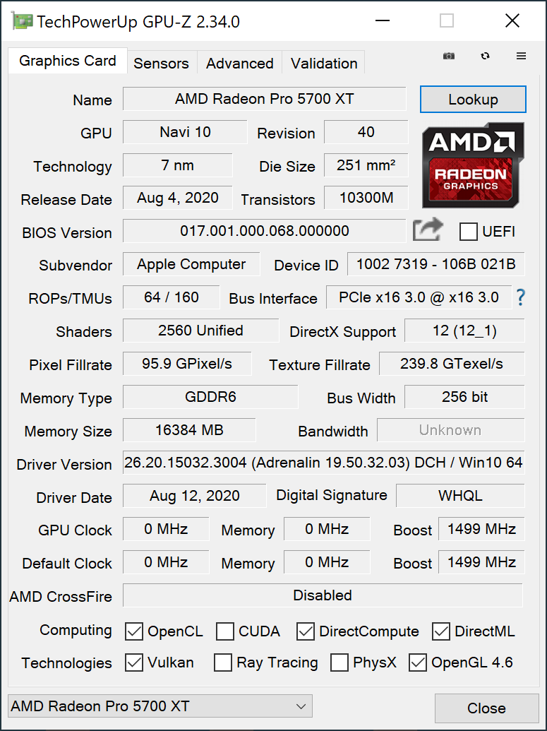 Apple iMac 27 Mid 2020 i9-10910, Radeon RX 5700 XT (Desktop), Apple SSD AP1024, IPS, 5120x2880, 27" | Apple iMac Pro W-2145, Pro Vega 56, , , 5120x2880, 27" | Apple iMac Retina 5K 27 Late 2015 3.2 GHz M390 MK472D/A 6500, Radeon R9 M390, Apple Fusion Drive 1TB (24 GB SSD + 1 TB HDD), , 5120x2880, 27" | Average AMD Radeon RX 5700 XT (Desktop) | Average of class Desktop | |