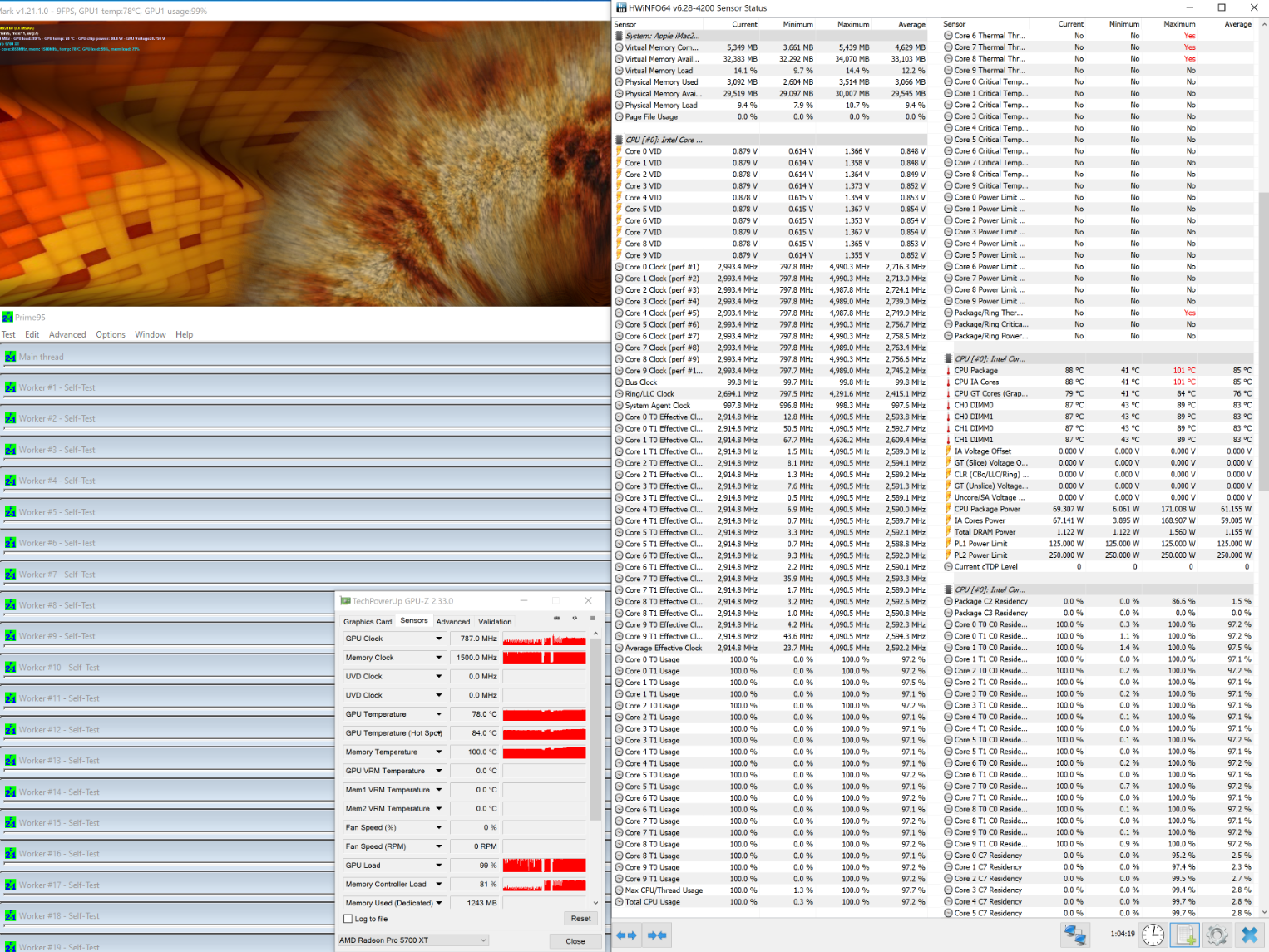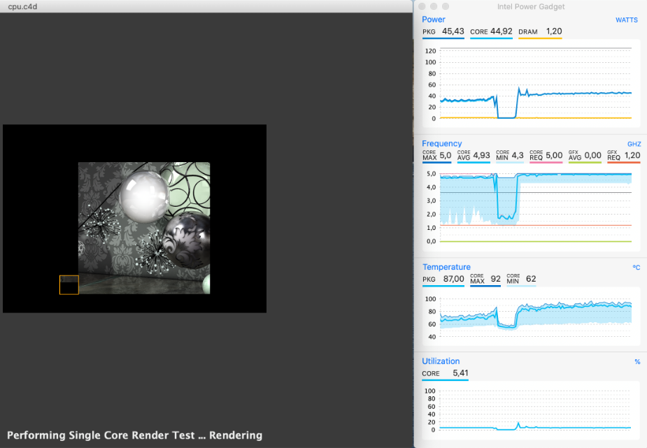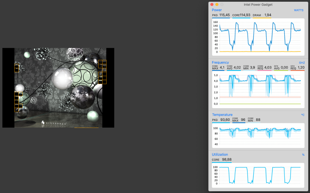 However, the performance utilization in the stress test is not particularly good, because the processor only runs at about 65 Watts (10x 3.0 GHz), which is significantly below the TDP recommendation of 125 W. The graphics card also runs at about 50% of the maximum clock. All in all, this shows that the cooling solution of the iMac 27 is insufficient for the components.