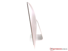 The design of the Apple iMac did not change since 2015, but there is still not much to criticize about the design of the all-in-one system. The case is almost completely made of aluminum and the build quality is perfect. However, the iMac 27 is no lightweight at almost 9 kg, but at least the power adapter is already included inside the case. You can change the tilting angle to a certain degree (see pictures below), but you cannot adjust the height. It is possible to use Vesa adapters for optional mounts.