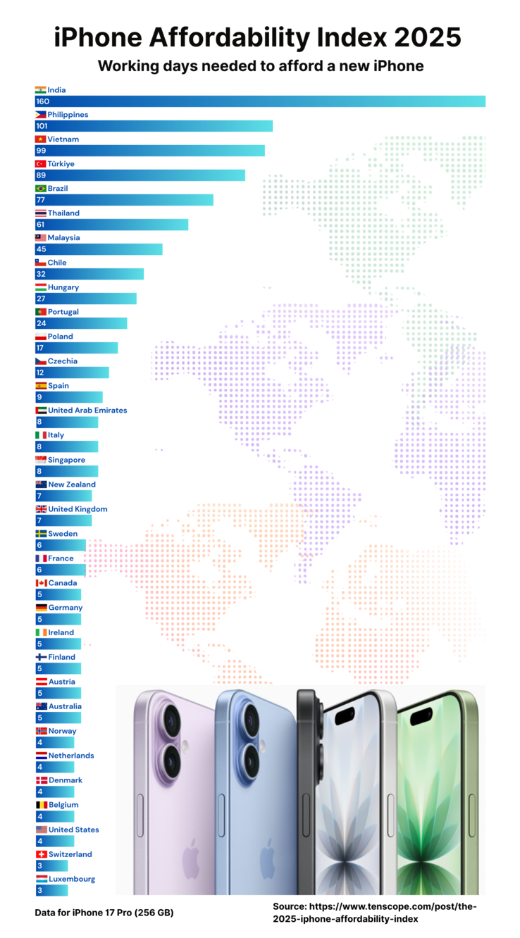 Tenscope has updated its iPhone Affordability Index using the recently released iPhone 17 Pro as a benchmark. This index offers a glimpse into global wealth inequality and income disparity. For instance, the average person in the US only needs four days of work to earn an iPhone 17 Pro (256 GB).