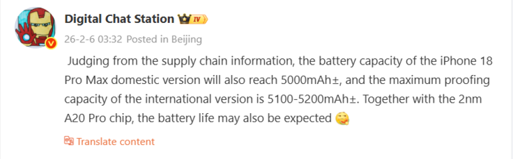 Based on information from the supply chain, Chinese leaker Digital Chat Station has just revealed, for the first time, fairly concrete details about the planned battery sizes that Apple is planning for the iPhone 18 Pro Max, expected later this year. Accordingly, there will again be two different iPhone 18 Pro Max models: an eSIM-only model with a battery capacity of around 5,100 mAh to 5,200 mAh, and a classic model with nano-SIM slots that will house a 5,000 mAh battery.