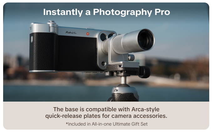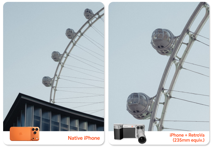 The camera grip features a two-stage shutter button for focusing and shooting, a multi-function button, a zoom rocker, and a control dial for adjusting settings such as exposure and ISO. Unlike the camera kits for Vivo and Oppo flagship phones, Retrova also includes a microSD card slot on the bottom, allowing you to write ProRes video recordings directly to the memory card at speeds up to 312 MB/s. The teleconverter, which screws onto the front of the telephoto lenses, transforms the iPhone 17 Pro's 4x telephoto lens into a 235mm equivalent 10x optical zoom. Using the iPhone 16 Pro's 5x telephoto lens, the 2.35x magnification factor results in a 282mm equivalent 12x telephoto lens.
