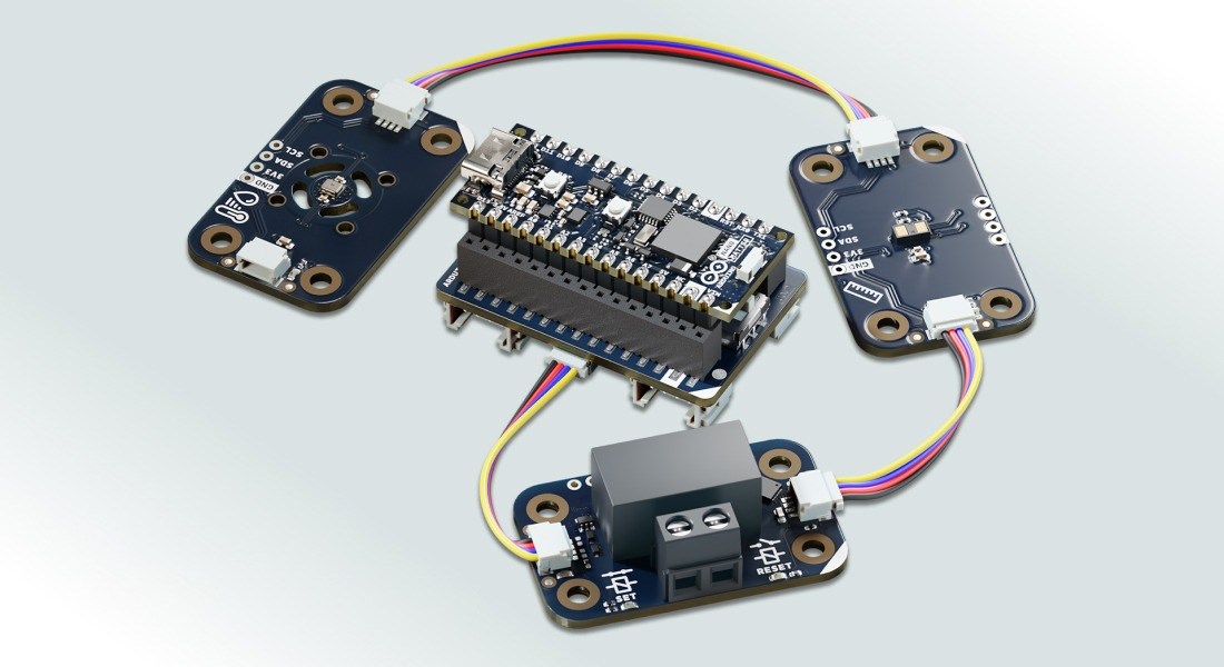 The kit is called the Arduino Matter Discovery Bundle, and it's based around the Nano Matter board, a Nano Connector Carrier with Qwiic expansion support, and multiple Modulino sensor and actuator nodes, such as Latch Relay, Distance, and Thermo nodes for building and testing Matter-enabled projects.
