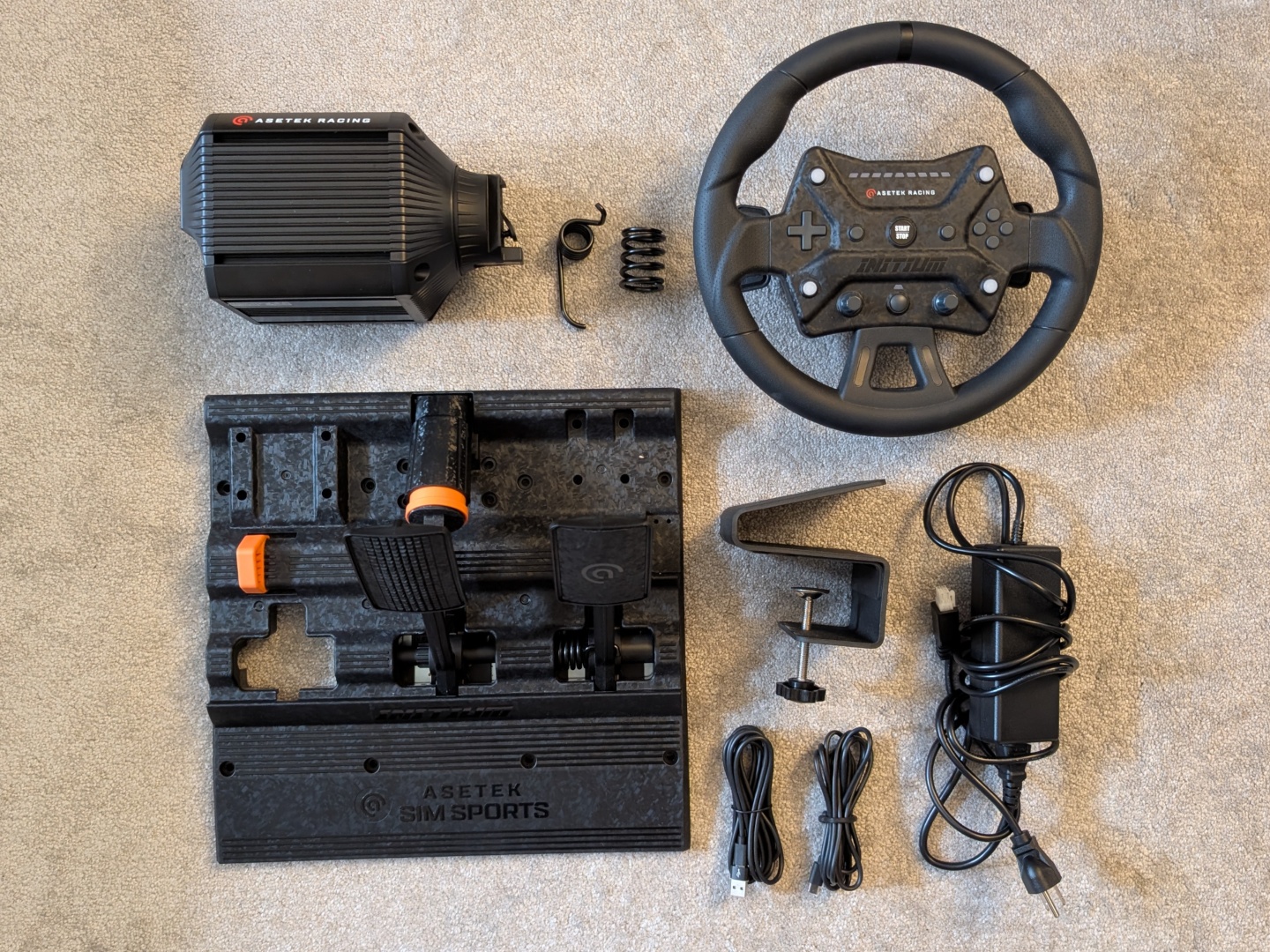 For being a bundle, the Asetek Initium kit comes in individual boxes for the wheelbase, steering wheel, and the pedals. Bundles from Moza, Turtle Beach, and others are generally packed within a single box making them much easier to put away when not being used. As for packaging, everything is foam protected and easy to assemble. The mounting hardware, desk clamp, and cables are neatly arranged as well. Asetek also provides extra springs for the brake and throttle to increase their stiffness.