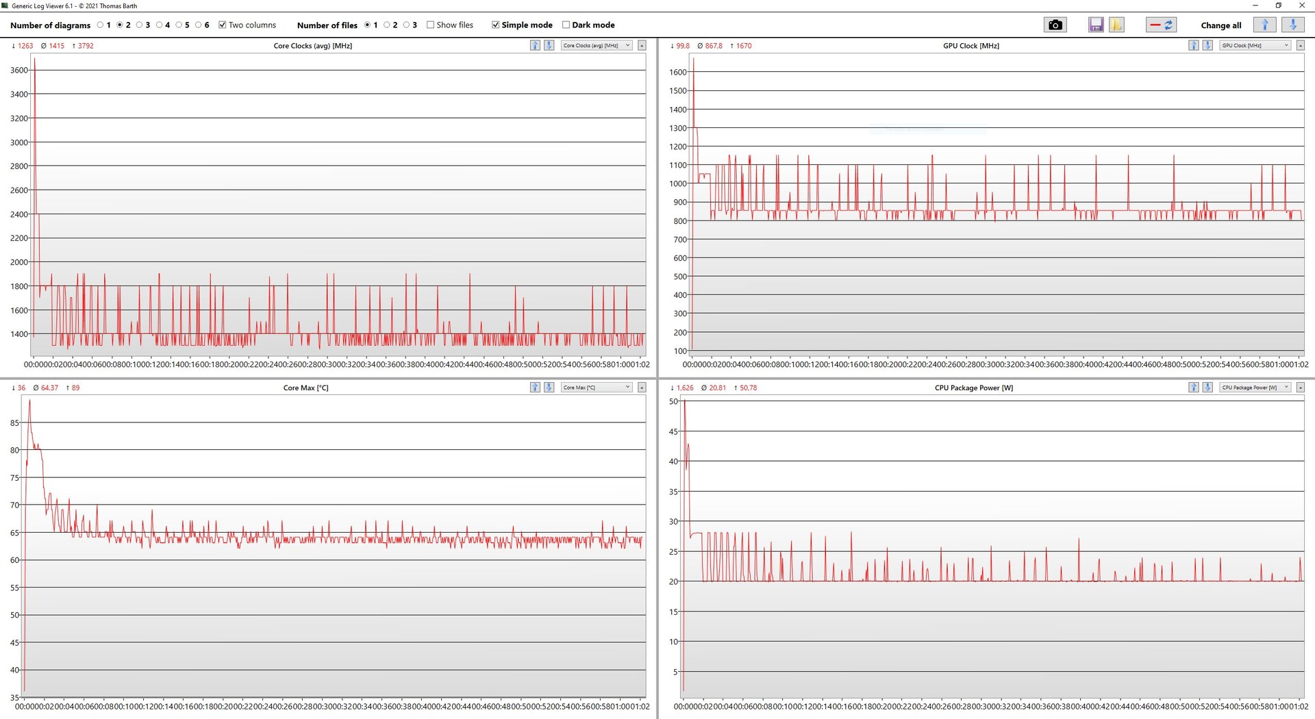 In our Cinebench R15 endurance test, the initial value is on a high level, and even reaches that of some notebooks with an Intel Core i7-1165G7. Afterwards, however, the result drops significantly and settles at an approximately 15 percent lower rate. The results of the individual disciplines are usually a bit below average and are often only enough for the last place in our test field.