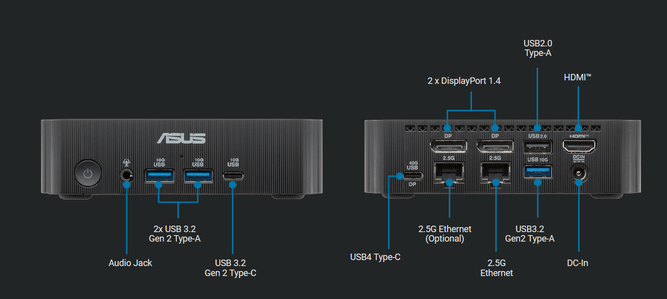 Connectivity options include Wi-Fi 7 (or Wi-Fi 6E), Bluetooth 5.4, and two 2.5 Gb/s Ethernet ports. Asus offers a wide range of I/O on the ExpertCenter PN54-S1, including USB 4.0, USB 3.2 Gen Type-A, USB 3.2 Gen 2 Type-C, USB 2.0, HDMI 2.1, and DisplayPort 1.4.